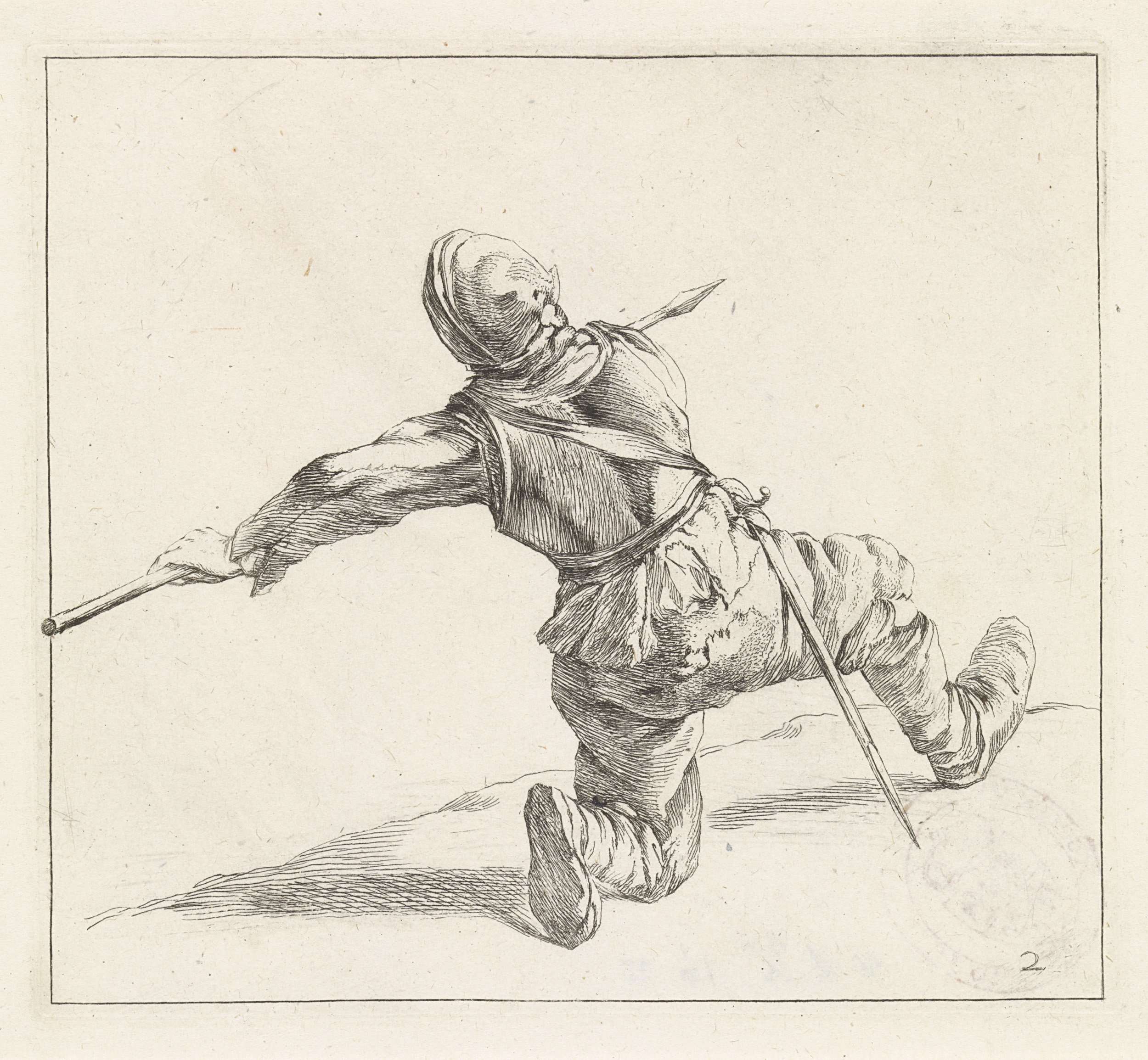 Geknielde piekenier met lans, op de rug gezien. Tweede prent uit een serie van twaalf prenten met voorstellingen van soldaten en paarden.
