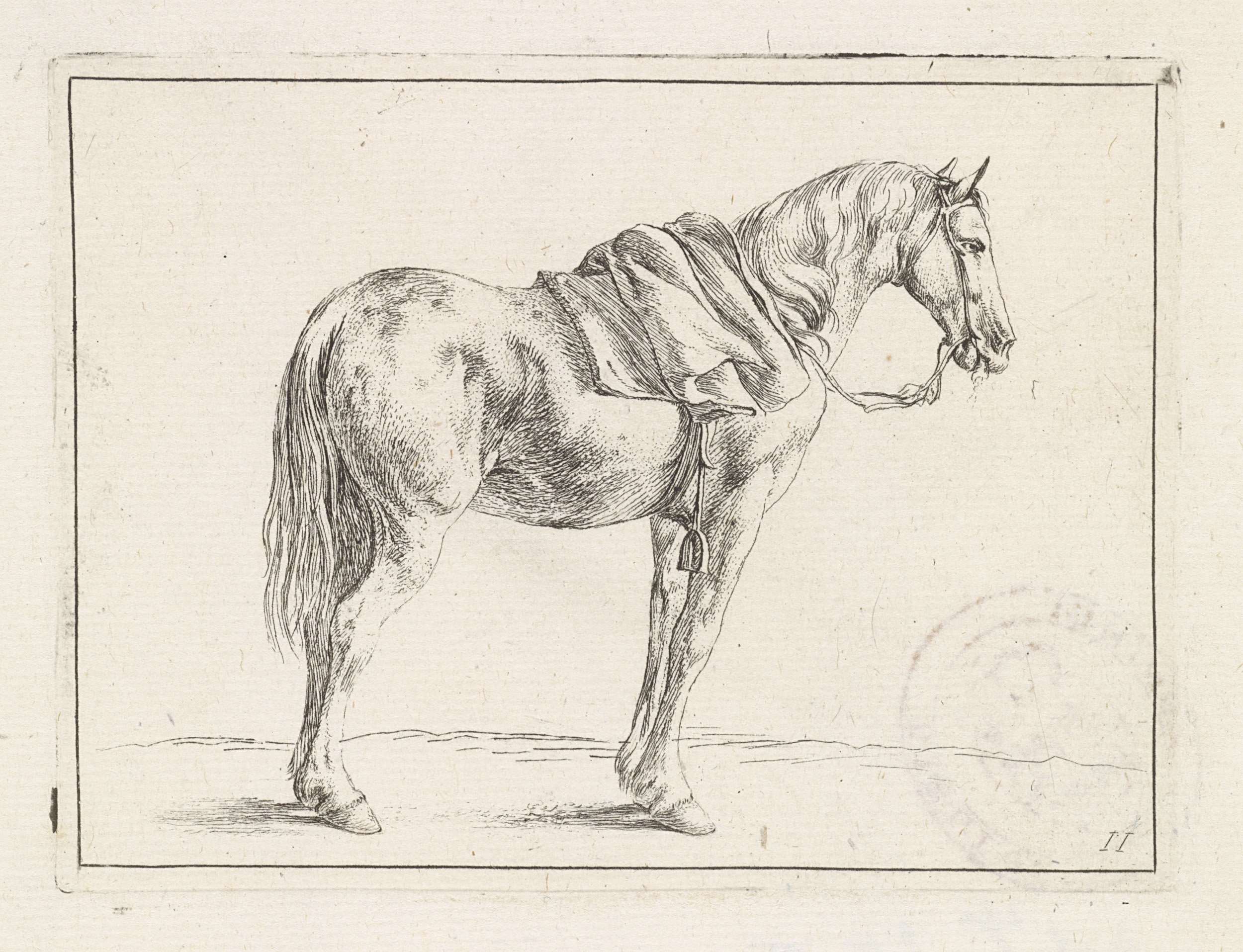 Gezadeld paard naar rechts. Elfde prent uit een serie van twaalf prenten met voorstellingen van soldaten en paarden.