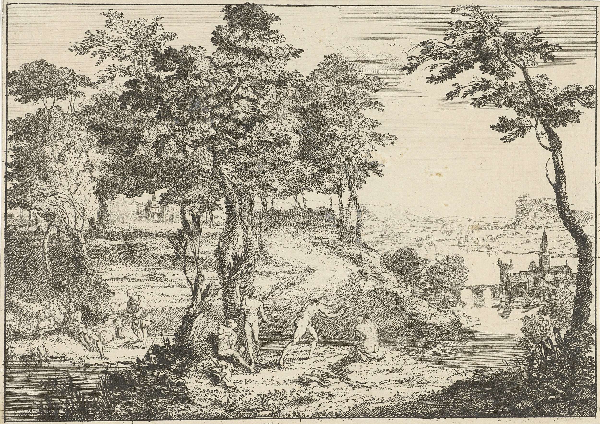 Landschap met links enkele hengelaars en rechts, op de oever van een rivier, enkele naakte figuren.