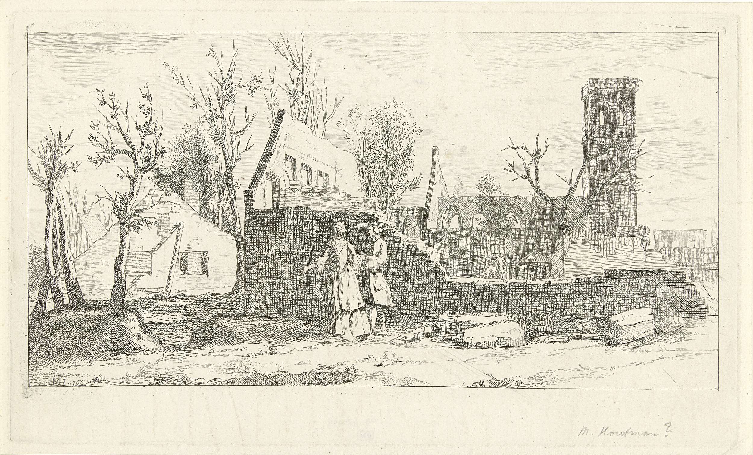 Zicht op een ruïne met op de voorgrond een man en vrouw.