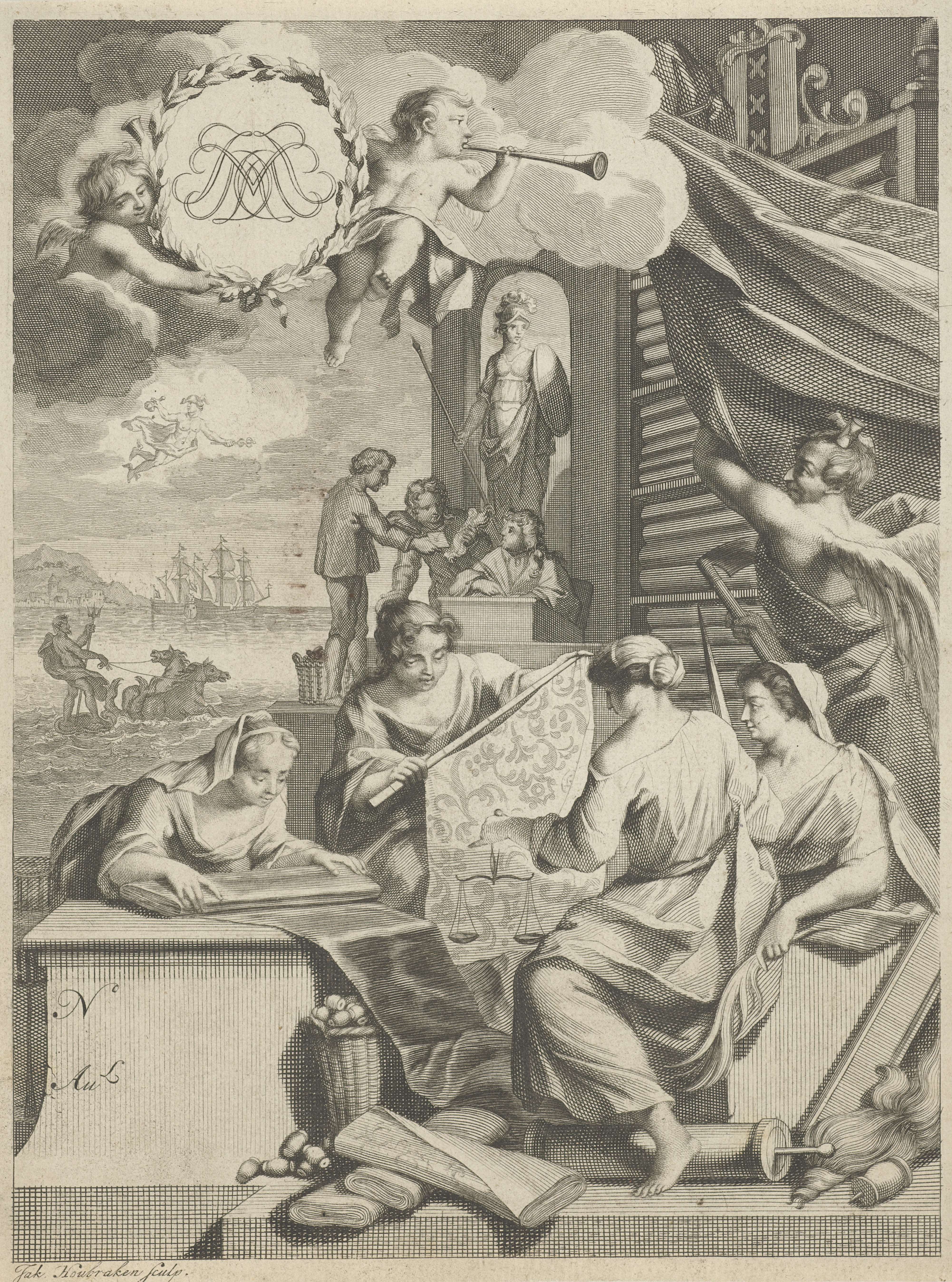 Vier vrouwen verwikkeld in de aanschaf en verkoop van zijden stoffen. Een vrouw heeft een weegschaal in haar hand. Twee andere vrouwen bekijken stoffen. Op de voorgrond nog meer stoffen, manden met klosjes en spinrokken. Achter hen houdt Vader Tijd een gordijn open waardoor een kast met rollen zijde is te zien en enkele zijdehandelaren. ...