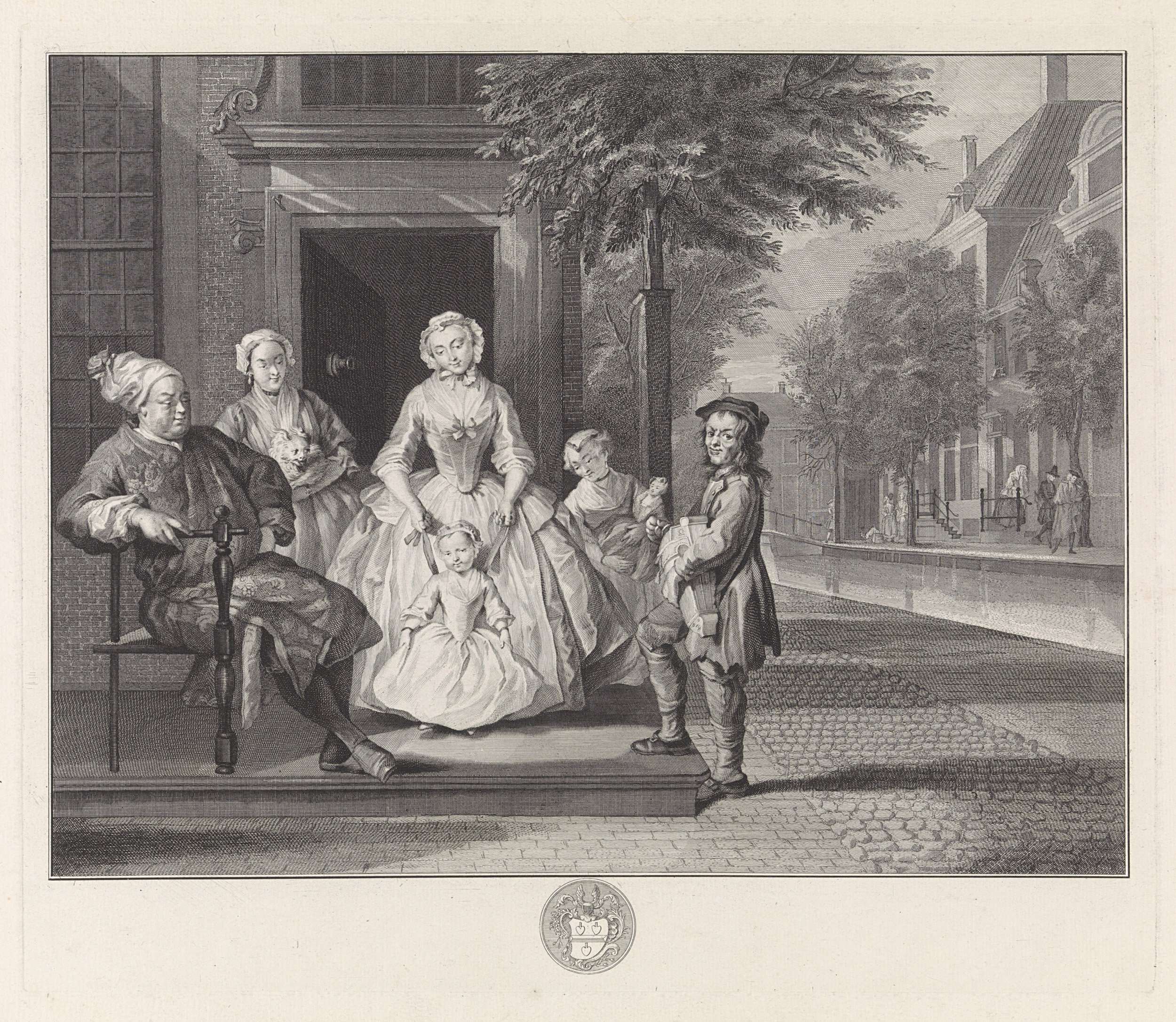 Op een stoep voor een deuropening in een stad zit een gezin waaronder twee jonge kinderen. Naast hen staat een straatmuzikant met een draailier. Rechts een gracht.