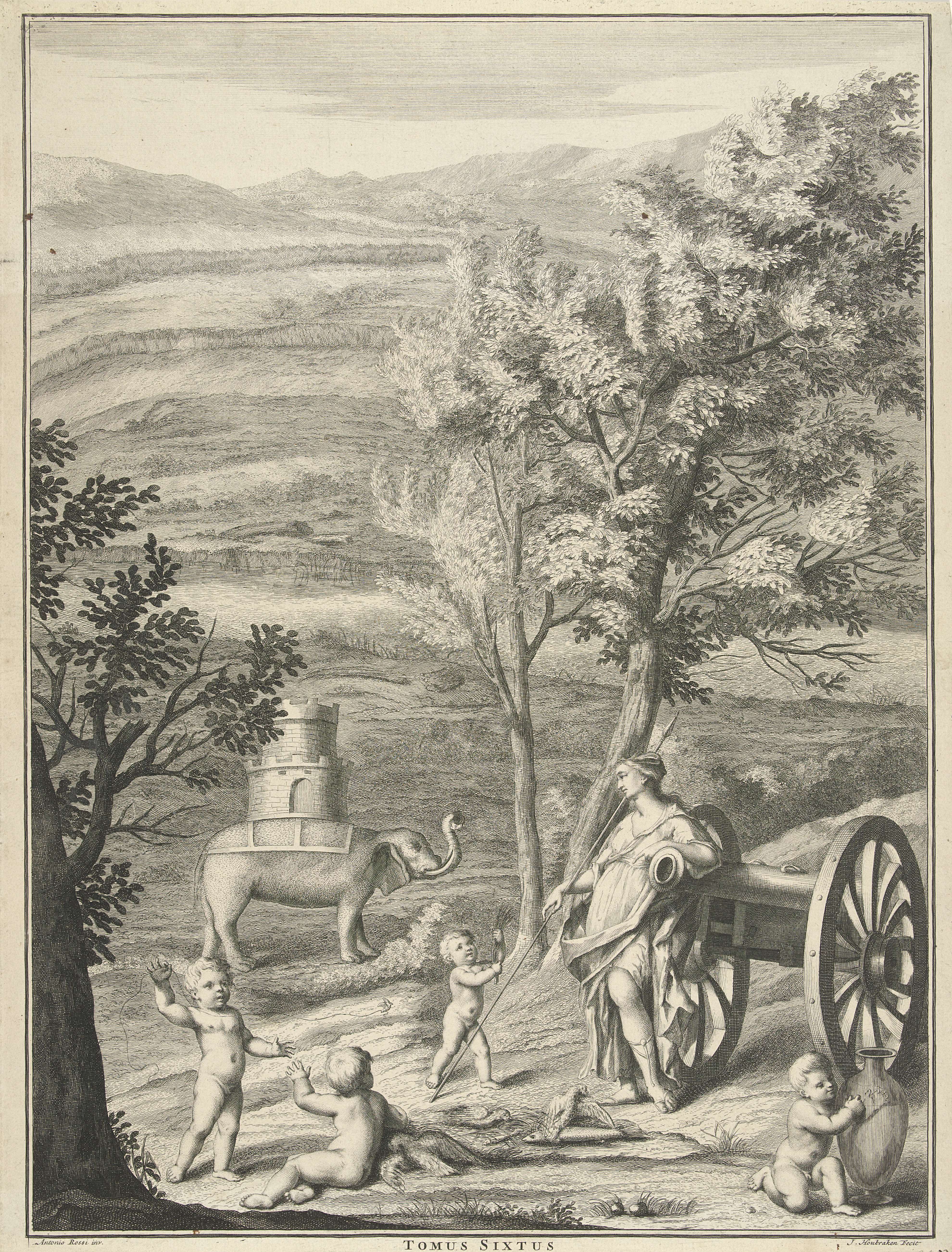 Landschap met vier putti, die zich onder andere bezighouden met het vangen van vogels en vissen, rond een allegorische vrouwenfiguur met een speer bij een kanon. In het landschap staat een olifant met een toren op zijn rug.
