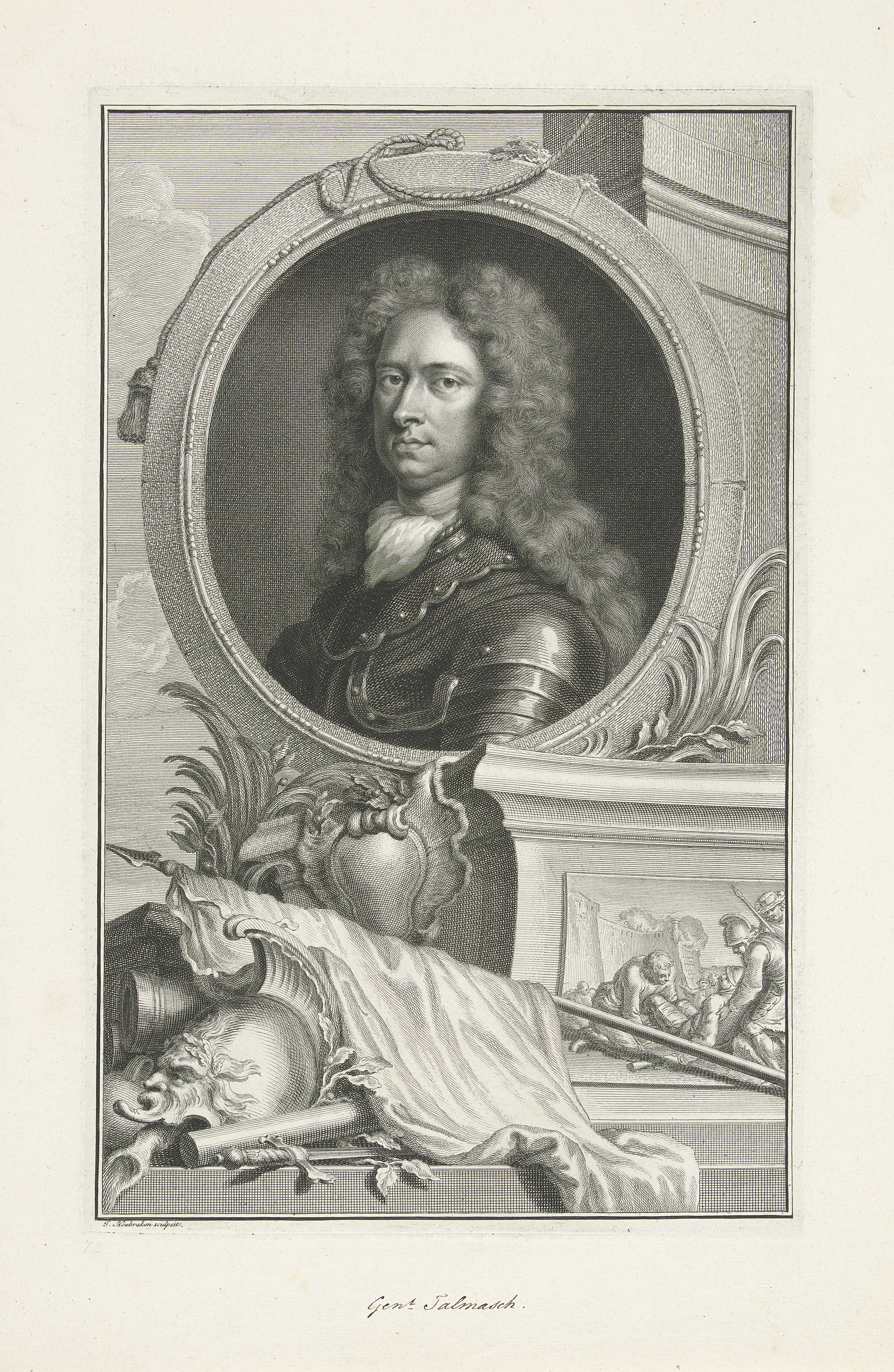 Portret van de militair Thomas Tollemache. Onder het portret een sokkel waarop een afbeelding waarin Tollemache fataal gewond bij een expeditie tegen de Fransen in Brest wordt weggedragen.