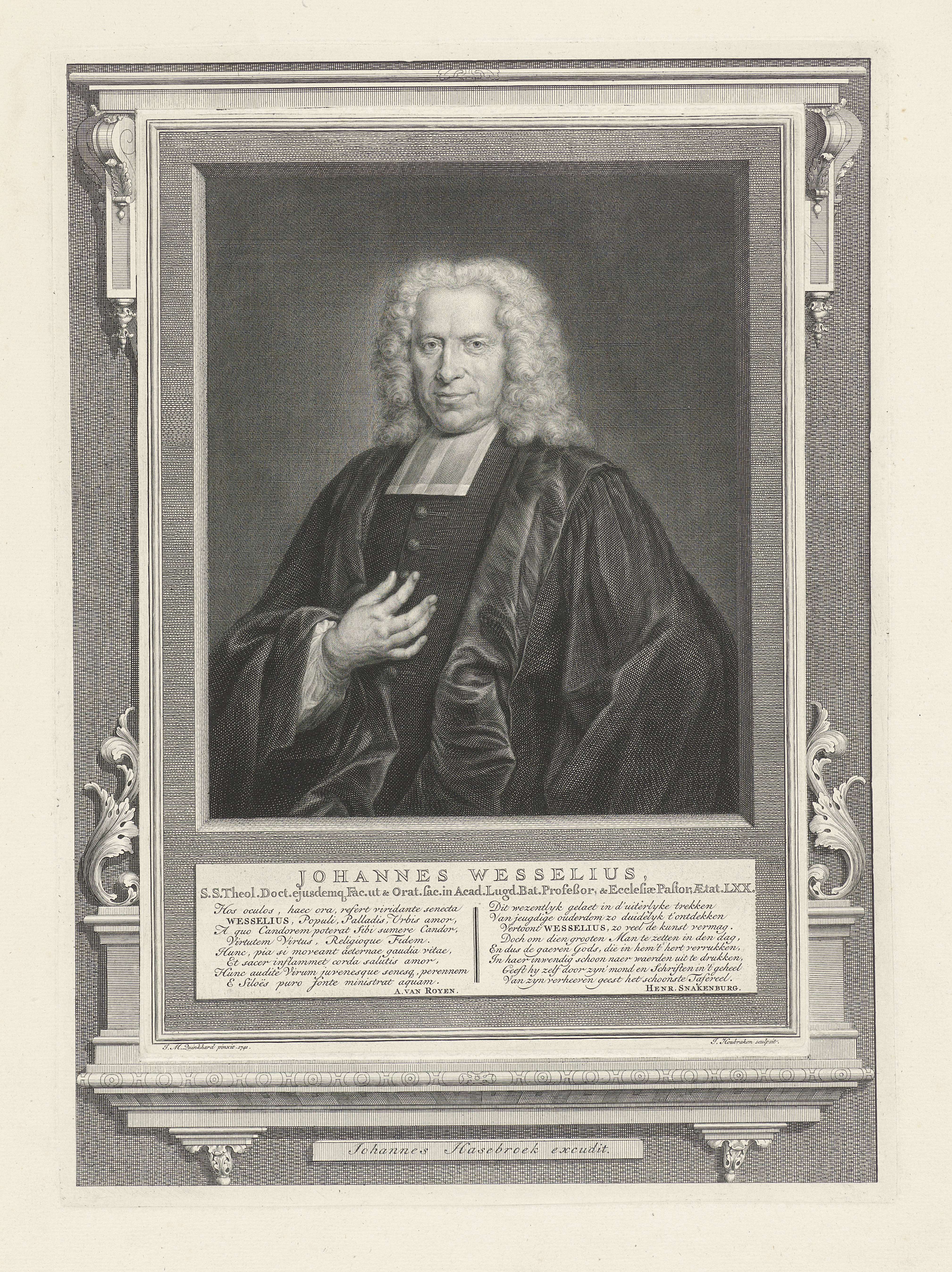 Portret ten halven lijve naar links van Johannes Wesselius. Onder het portret zijn naam en titel in twee regels in het Latijn, daaronder naast elkaar twee verzen van elk acht regels; links in het Latijn en rechts in het Nederlands. Rond de voorstelling een afdruk van een tweede plaat met een voorstelling van een ornamentele ...