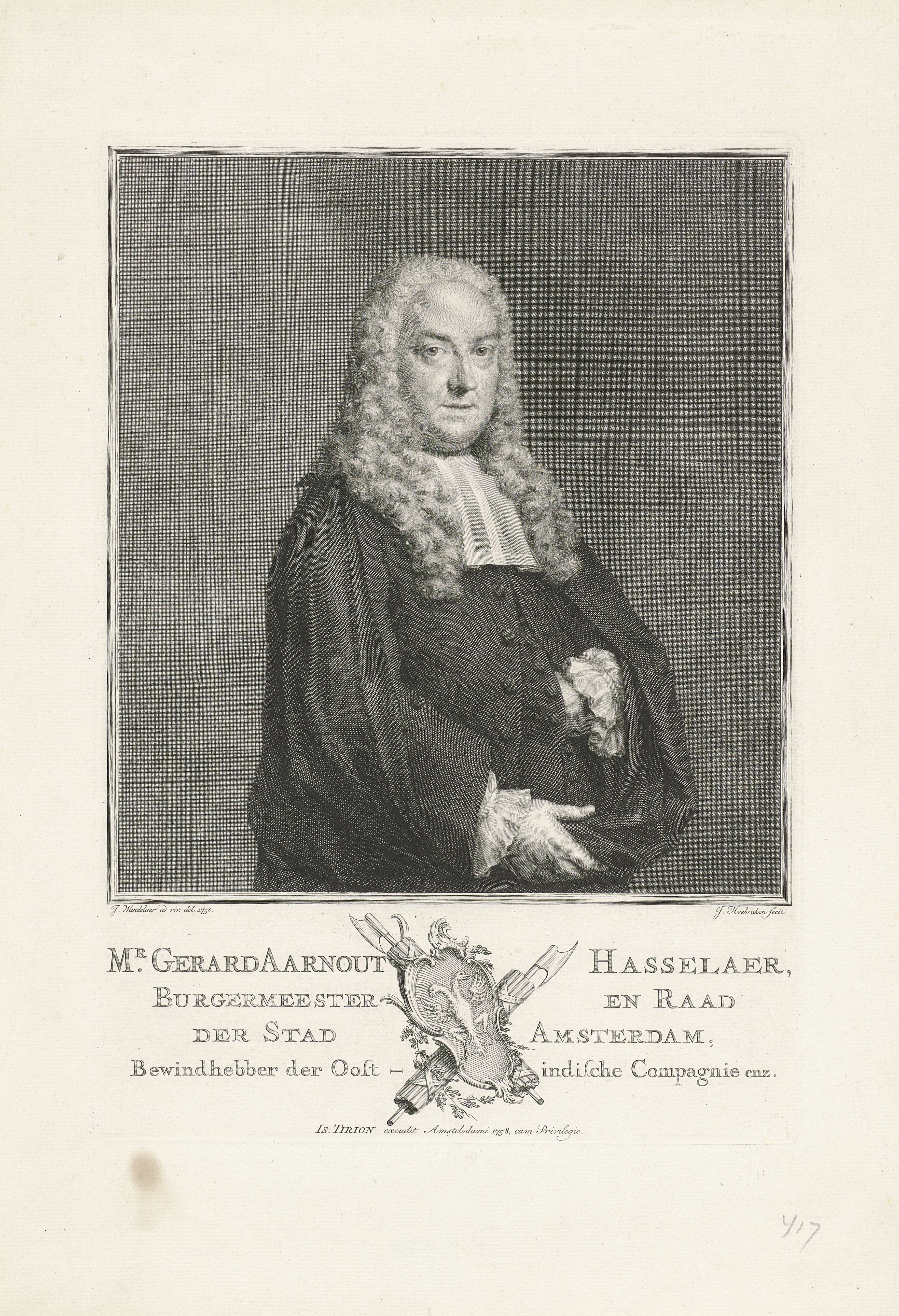 Portret naar rechts van Gerard Aarnout Hasselaer, burgemeester en raadslid van Amsterdam. Onder het portret zijn wapen en een vierregelige tekst in het Nederlands.