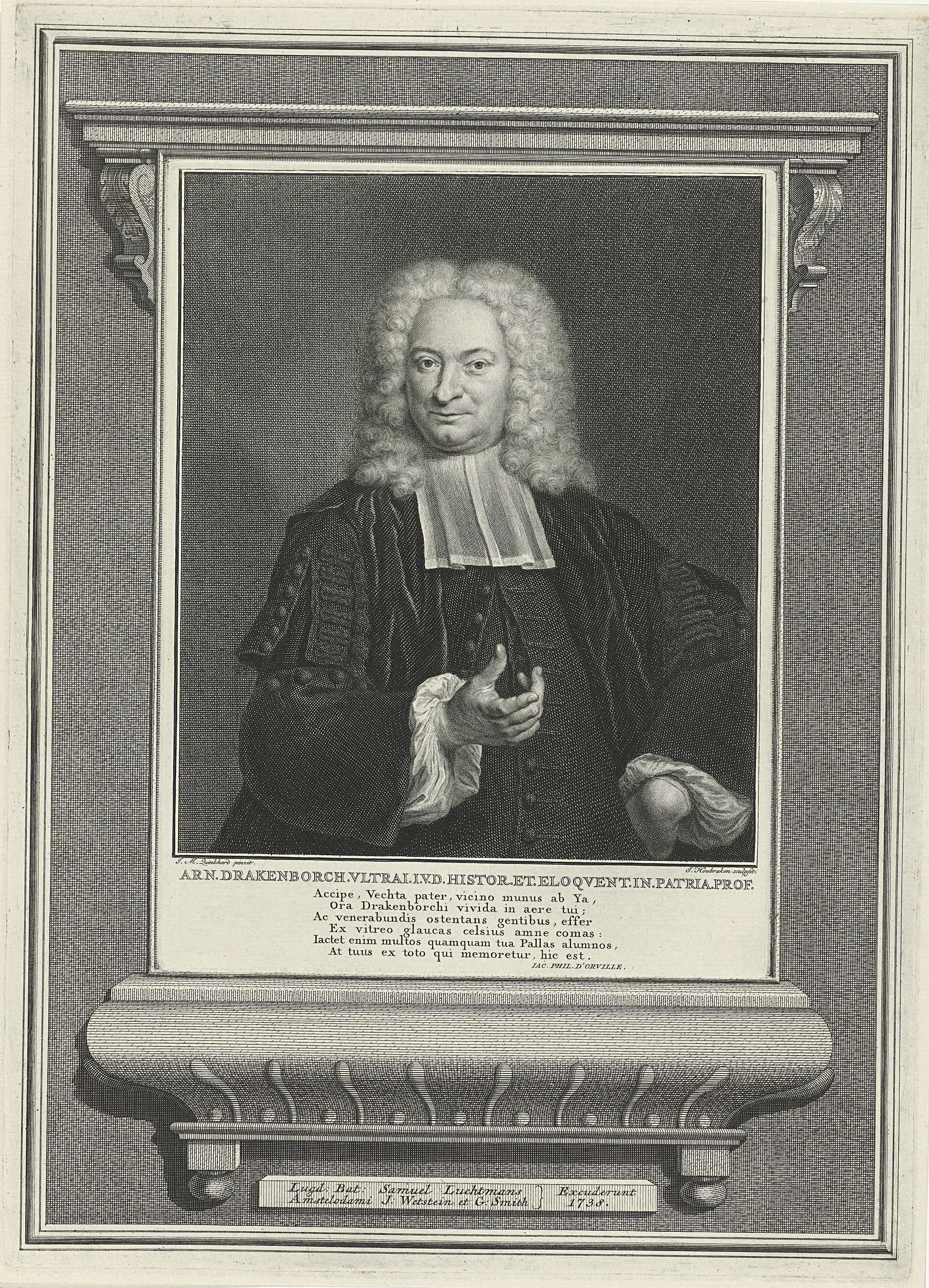 Portret ten halven lijve van Arnoldus Drakenborch. Onder het portret zijn naam en titel en een zesregelig vers in het Latijn. Rond de voorstelling een afdruk van een tweede plaat met een voorstelling van een piëdestal en een bovenversiering met onderaan het impressum.