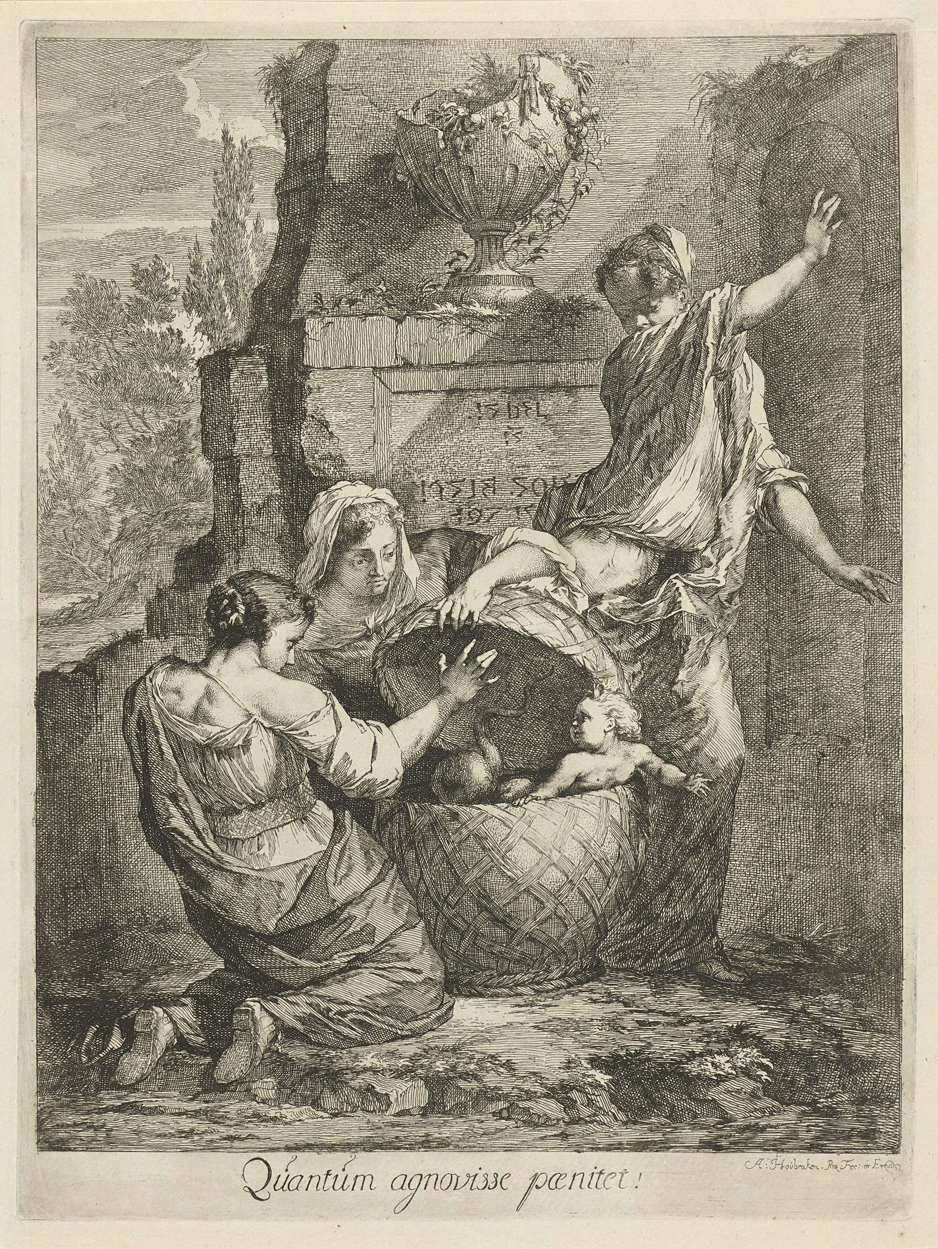 Erichthonius, geboren uit het verspilde zaad van Vulcanus op Moeder Aarde en door Minerva opgesloten in een mand, wordt gevonden door de drie dochters van Cecrops, de koning van Attica. Het kind heeft een slangenstaart in plaats van benen, waar de drie dochter hevig van schrikken. Onder de voorstelling een regel in het Latijn.