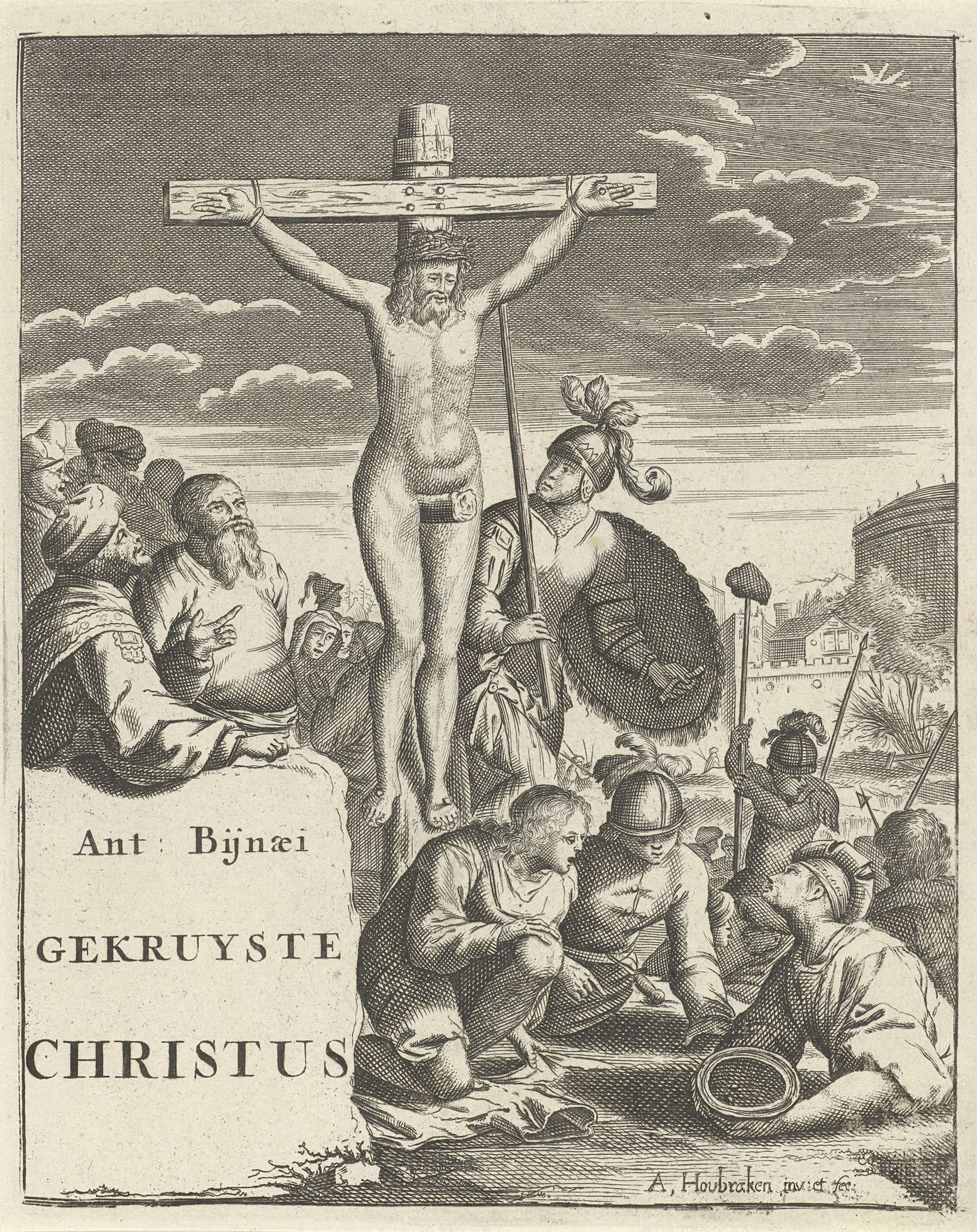 Christus aan het kruis. Op de voorgrond drie dobbelende soldaten, naast het kruis een krijgsman met het schild aan de linkerarm en een speer in de rechterhand. Titelpagina van de zesde uitgave van Antonius Baynaeus Gekruiste Christus, in 1725.
