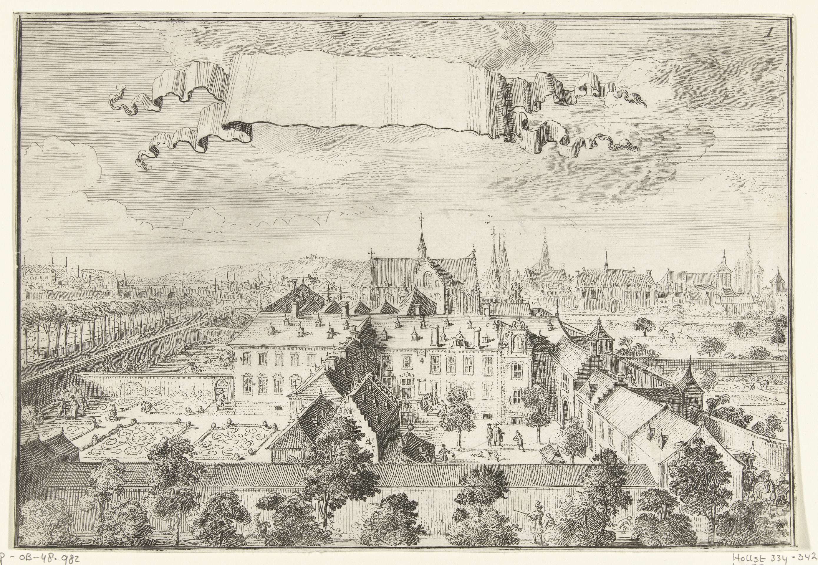 Gezicht op kasteel Nieuwen Biesen te Maastricht. Bovenin de voorstelling een banderol zonder tekst. Deze prent maakt deel uit van een omvangrijke voorstelling, samengesteld uit 20 afzonderlijke platen, van de geschiedenis en de werken van de Duitse Orde (midden) omgeven door voorstellingen van de landcommanderij Alden Biesen (onderaan) en de daarbij behorende commanderijen (links en ...