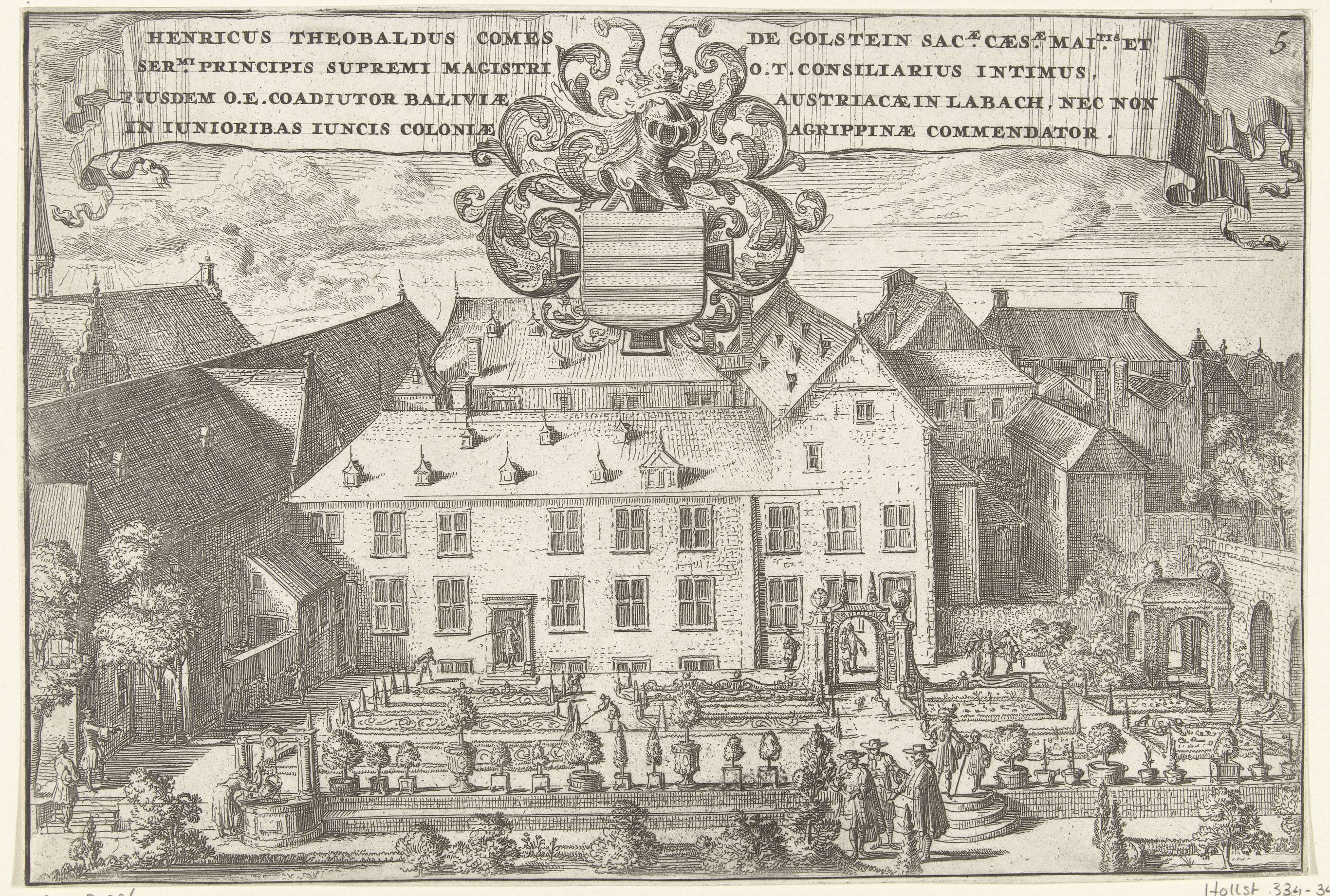 Gezicht op kasteel Jungen Biesen te Keulen. Bovenin de voorstelling een banderol met Latijnse tekst en een wapen. Deze prent maakt deel uit van een omvangrijke voorstelling, samengesteld uit 20 afzonderlijke platen, van de geschiedenis en de werken van de Duitse Orde (midden) omgeven door voorstellingen van de landcommanderij Alden Biesen (onderaan) en de daarbij ...