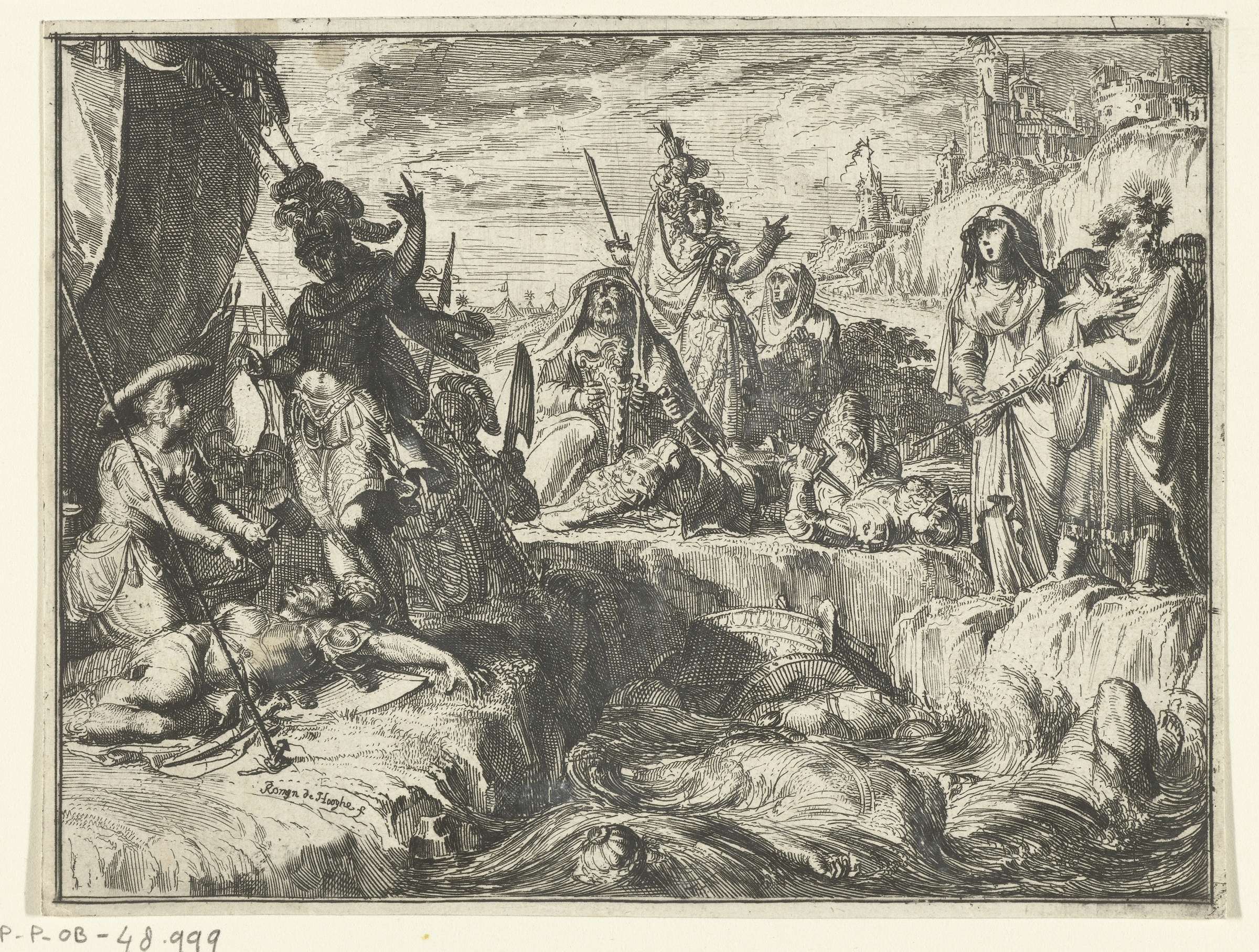 De soldaten van Farao worden verzwolgen door de Rode Zee. Rechts aan de oever staat Mozes met staf.
