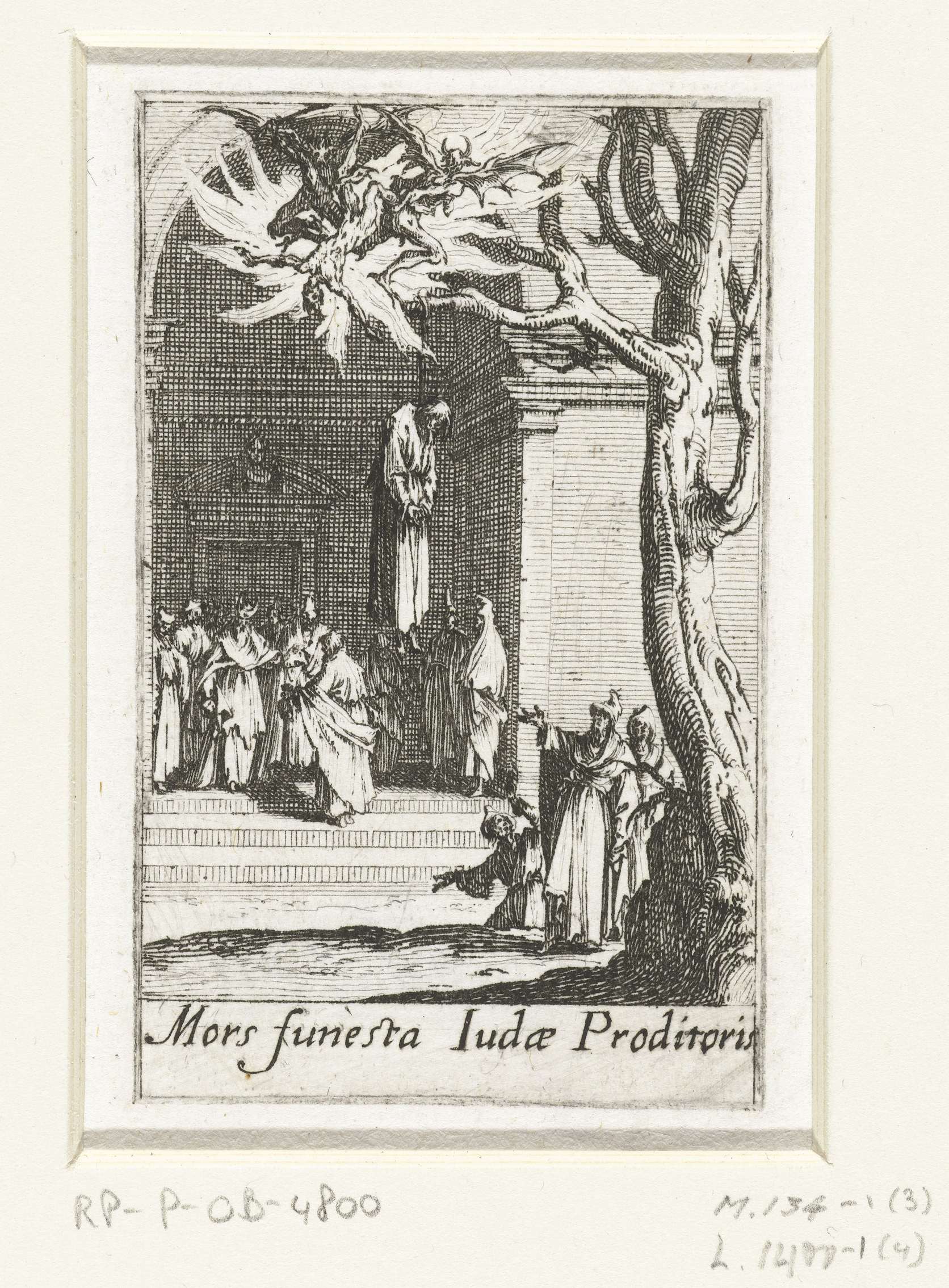 Een aantal mensen kijken met afgrijzen naar het dode lichaam van Judas Iskariot, die zichzelf heeft opgehangen. Duivelse wezens nemen zijn ziel mee. Onder de voorstelling een onderschrift in Latijn. Deze prent is onderdeel van een reeks van 16 prenten, bestaande uit een titelblad en 15 voorstellingen van de martelingen die de apostelen hebben ondergaan