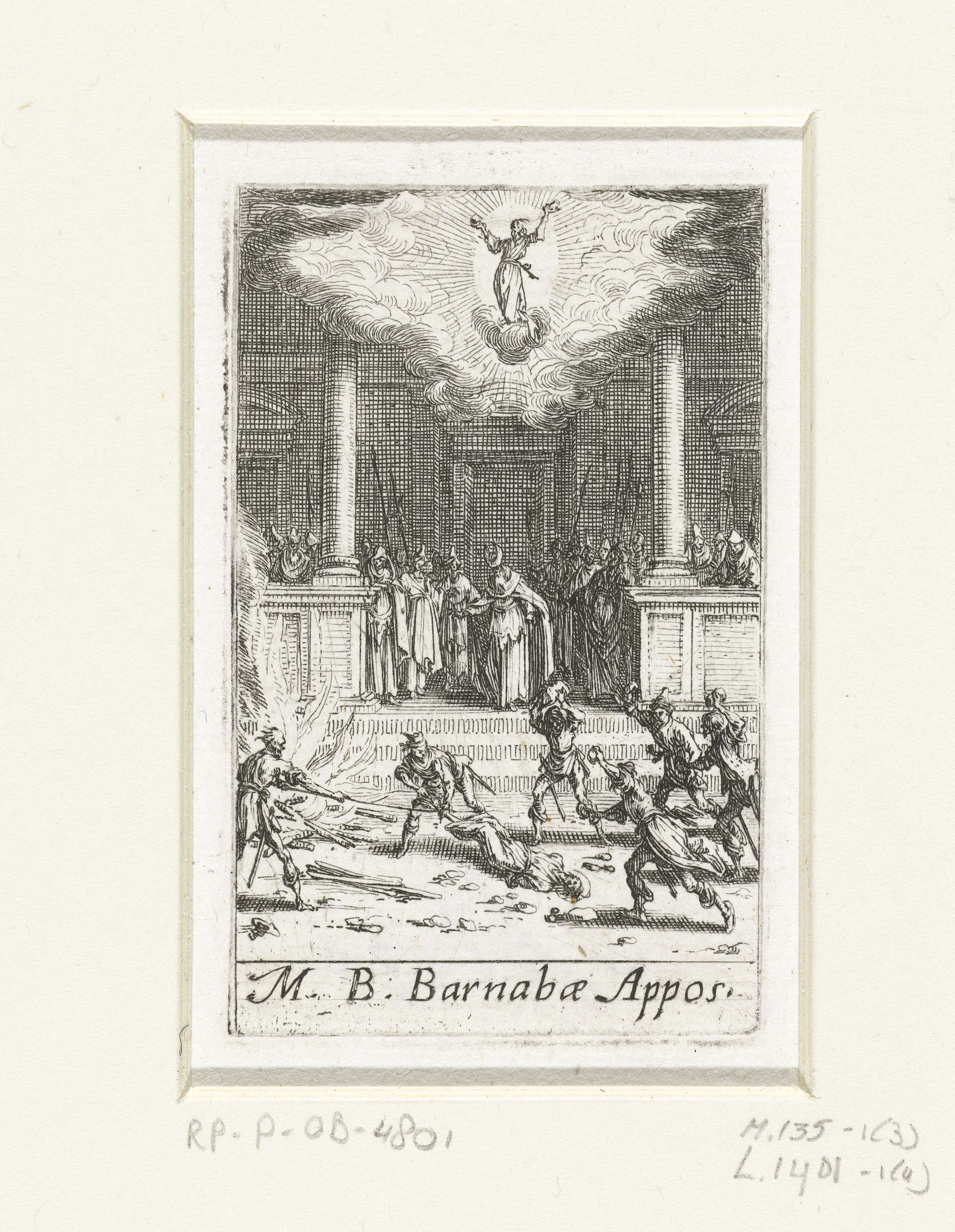 Barnabas wordt, nadat hij is gestenigd, door twee mannen gebonden naar een open vuur gesleept. Boven deze scène is Barnabas nogmaals afgebeeld, op een wolk in de hemel, een steen in de hand. Onder de voorstelling een onderschrift in Latijn. Deze prent is onderdeel van een reeks van 16 prenten, bestaande uit een titelblad en ...