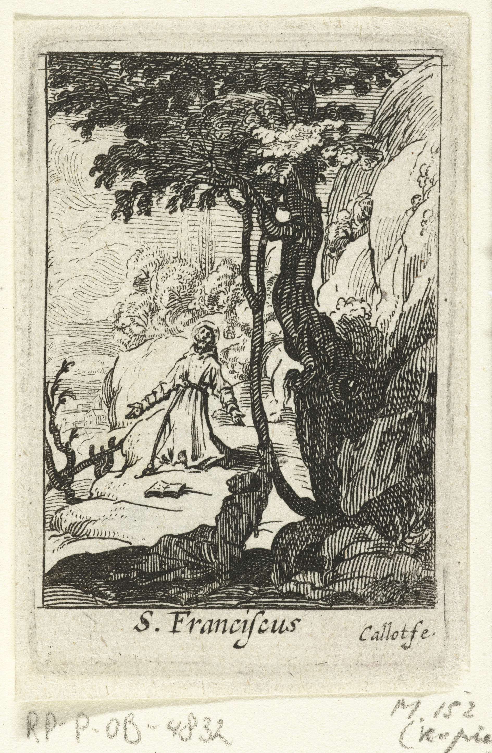 In een rotsachtige omgeving zit Franciscus op zijn knieën, zijn armen gespreid in een smekend gebaar. Op de voorgrond zijn metgezel bij een boom. Onder de voorstelling een onderschrift in Latijn. Deze prent is onderdeel van een serie van vijf prenten van boetvaardige heiligen.