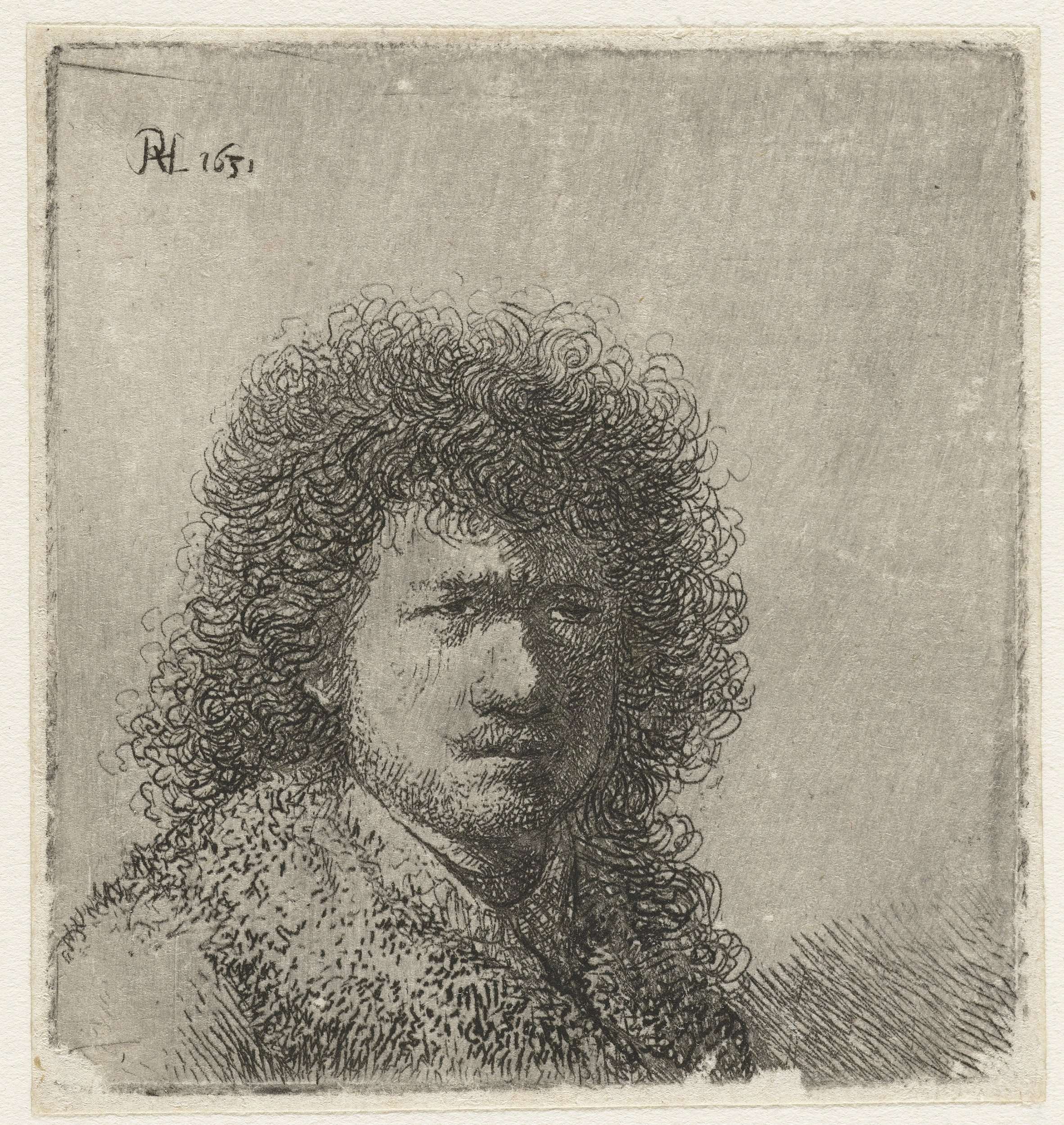 Zelfportret van Rembrandt met grote bos krullend haar.
