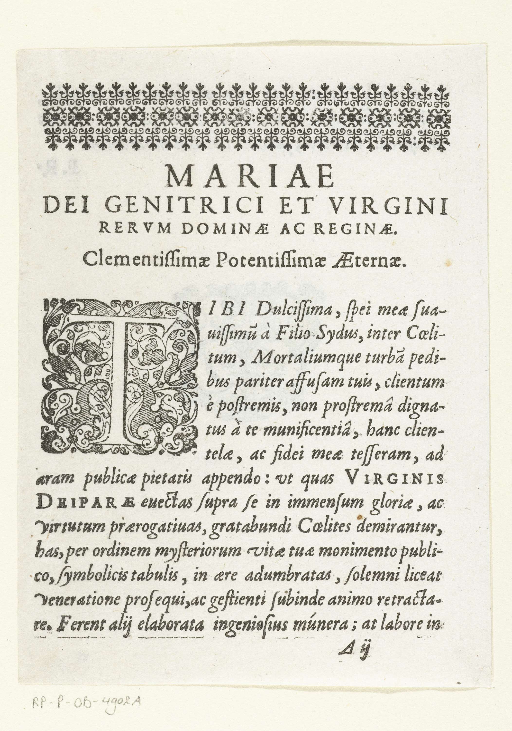 Een lovende tekst, gericht aan Maria, gesteld in Latijns proza. Dit blad (aan beide zijden bedrukt) is onderdeel van de eerste staat van de embleemserie 'Leven van Maria in emblemen', die naast een titelpagina en deze lofzang nog twee lofzangen en 26 emblemen behelst.