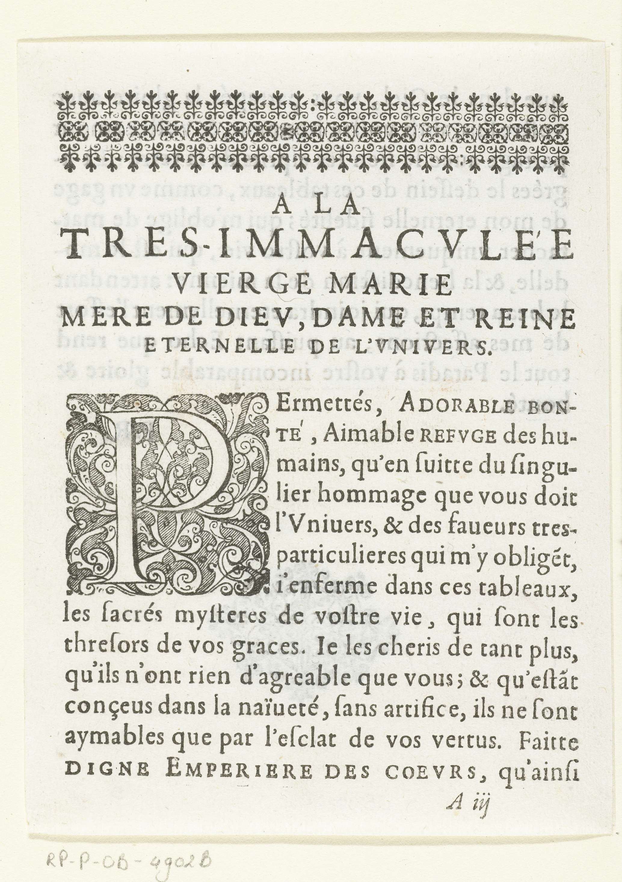 Een lovende tekst, gericht aan Maria, gesteld in Frans proza. Dit blad (aan beide zijden bedrukt) is onderdeel van de eerste staat van de embleemserie 'Leven van Maria in emblemen', die naast een titelpagina en deze lofzang nog twee lofzangen en 26 emblemen behelst.