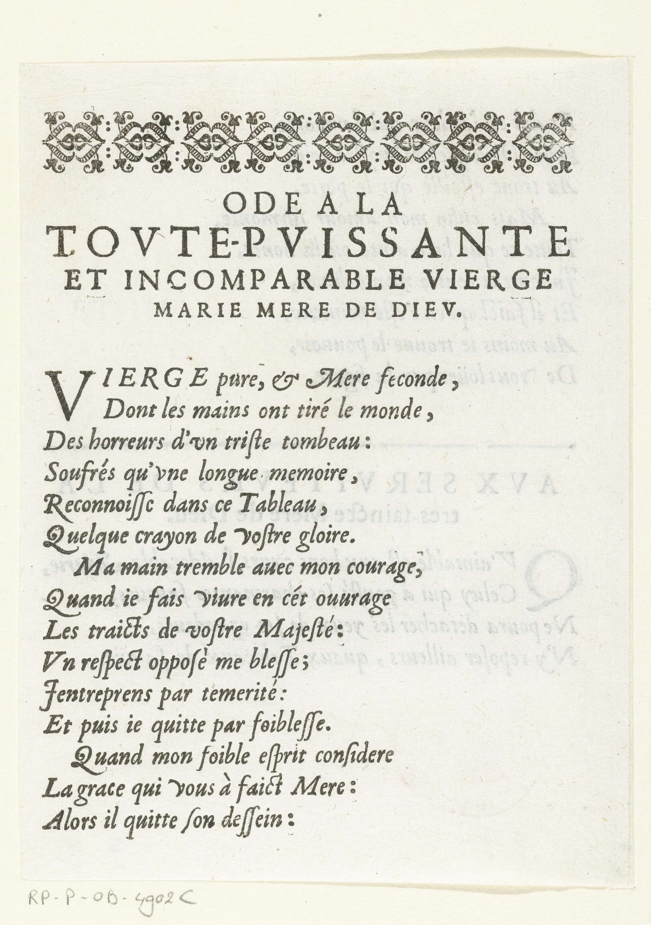 Een lovende tekst, gericht aan Maria, gesteld in Franse verzen. Dit blad (aan beide zijden bedrukt) is onderdeel van de eerste staat van de embleemserie 'Leven van Maria in emblemen', die naast een titelpagina en deze lofzang nog twee lofzangen en 26 emblemen behelst.