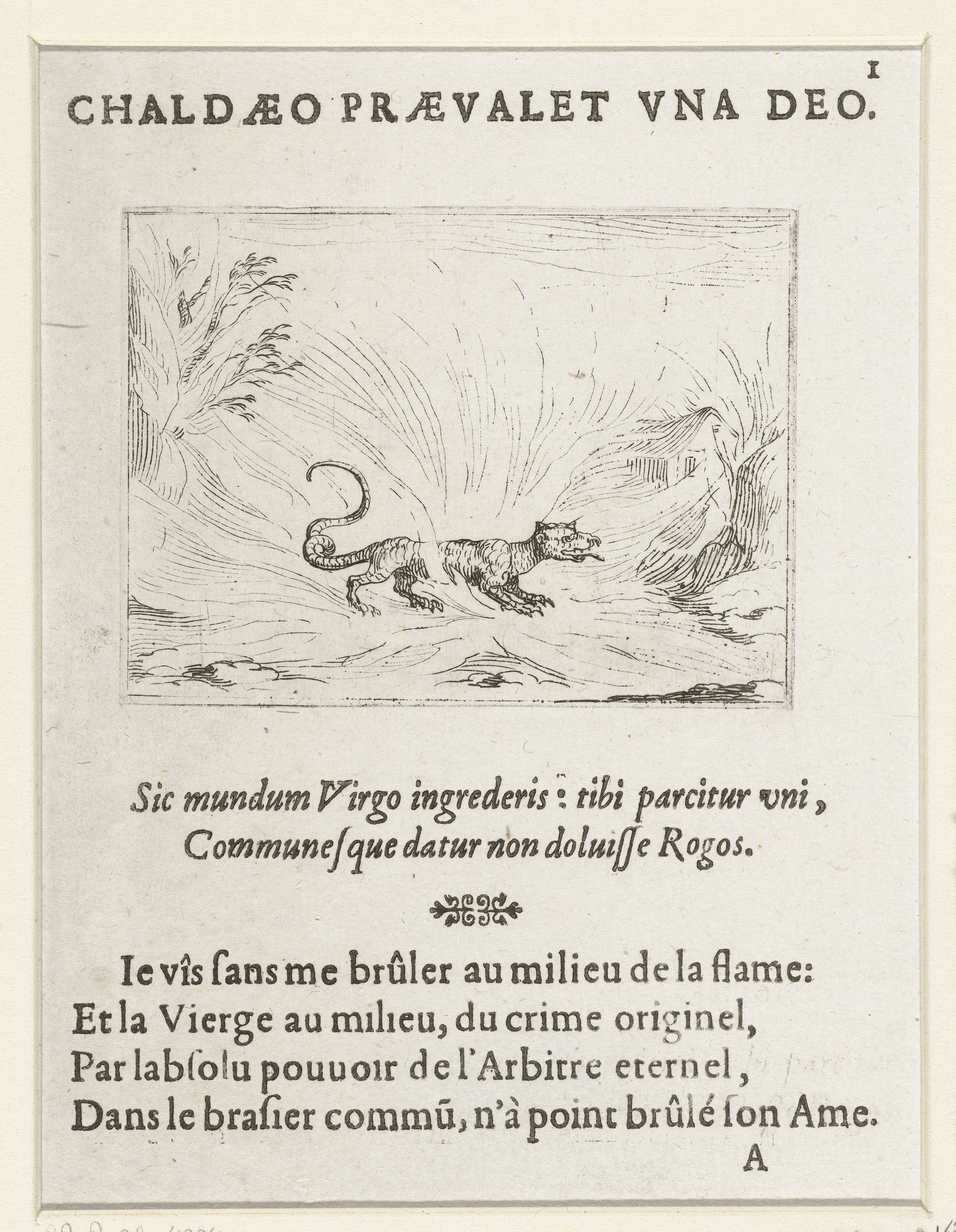 Voorstelling van een salamander omgeven door vlammen. Rechts op de achtergrond een huisje. Boven en onder deze prent Latijnse en Franse teksten in boekdruk. Dit blad is onderdeel van de embleemserie 'Leven van Maria in emblemen'. De eerste staat van deze serie behelst naast een titelpagina en 26 emblemen ook drie bladen met lofzangen op ...