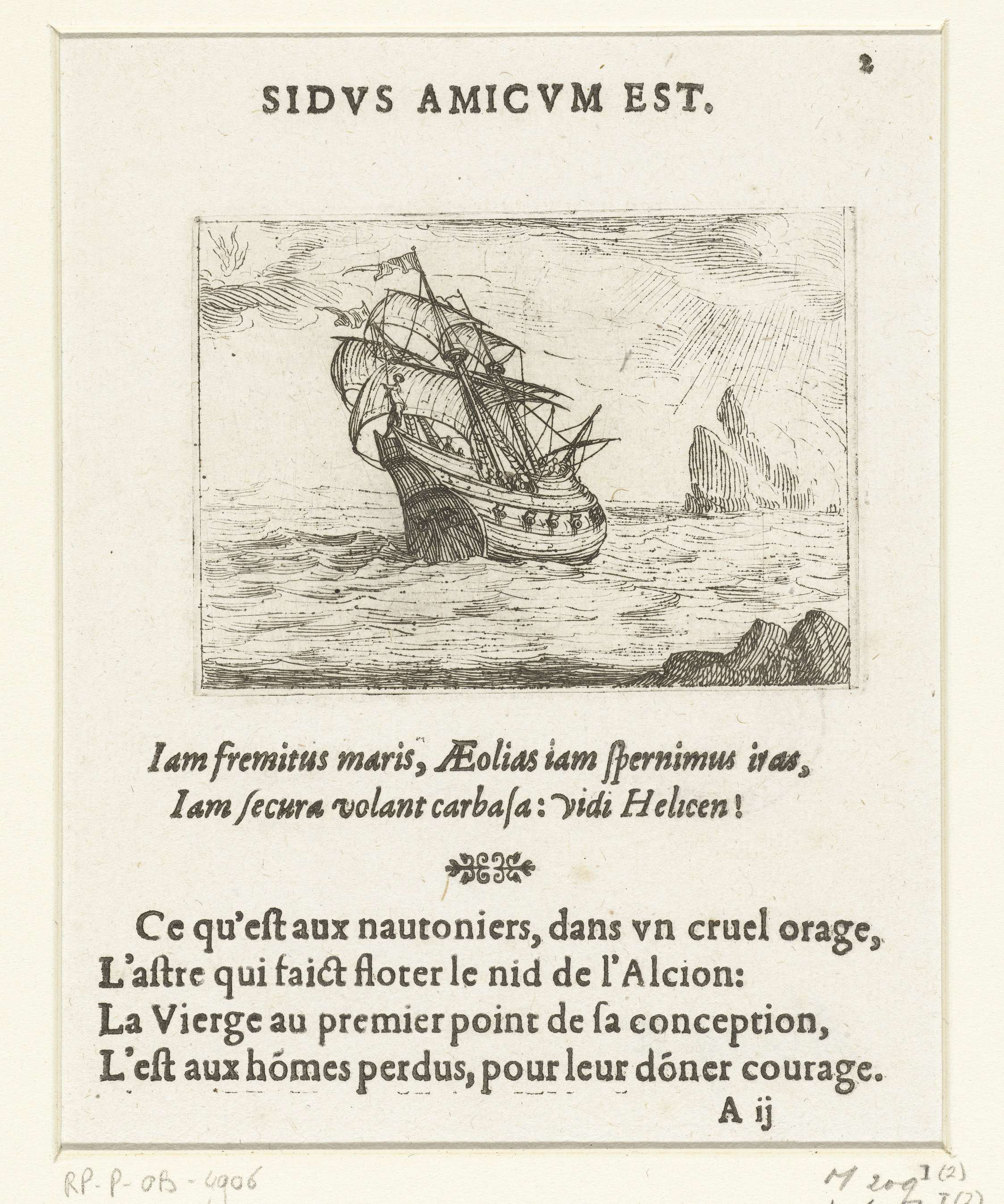 Voorstelling van een schip op ruige zee, dat langs een rotspartij vaart. Boven en onder deze prent Latijnse en Franse teksten in boekdruk. Dit blad is onderdeel van de embleemserie 'Leven van Maria in emblemen'. De eerste staat van deze serie behelst naast een titelpagina en 26 emblemen ook drie bladen met lofzangen op Maria ...