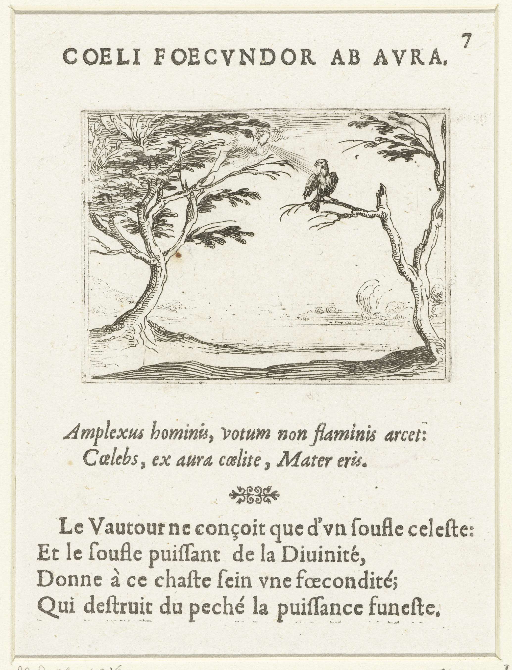 Voorstelling van een gier op een boomtak. Een gezichtje in een wolk blaast naar hem. Boven en onder deze prent Latijnse en Franse teksten in boekdruk. Dit blad is onderdeel van de embleemserie 'Leven van Maria in emblemen'. De eerste staat van deze serie behelst naast een titelpagina en 26 emblemen ook drie bladen met ...