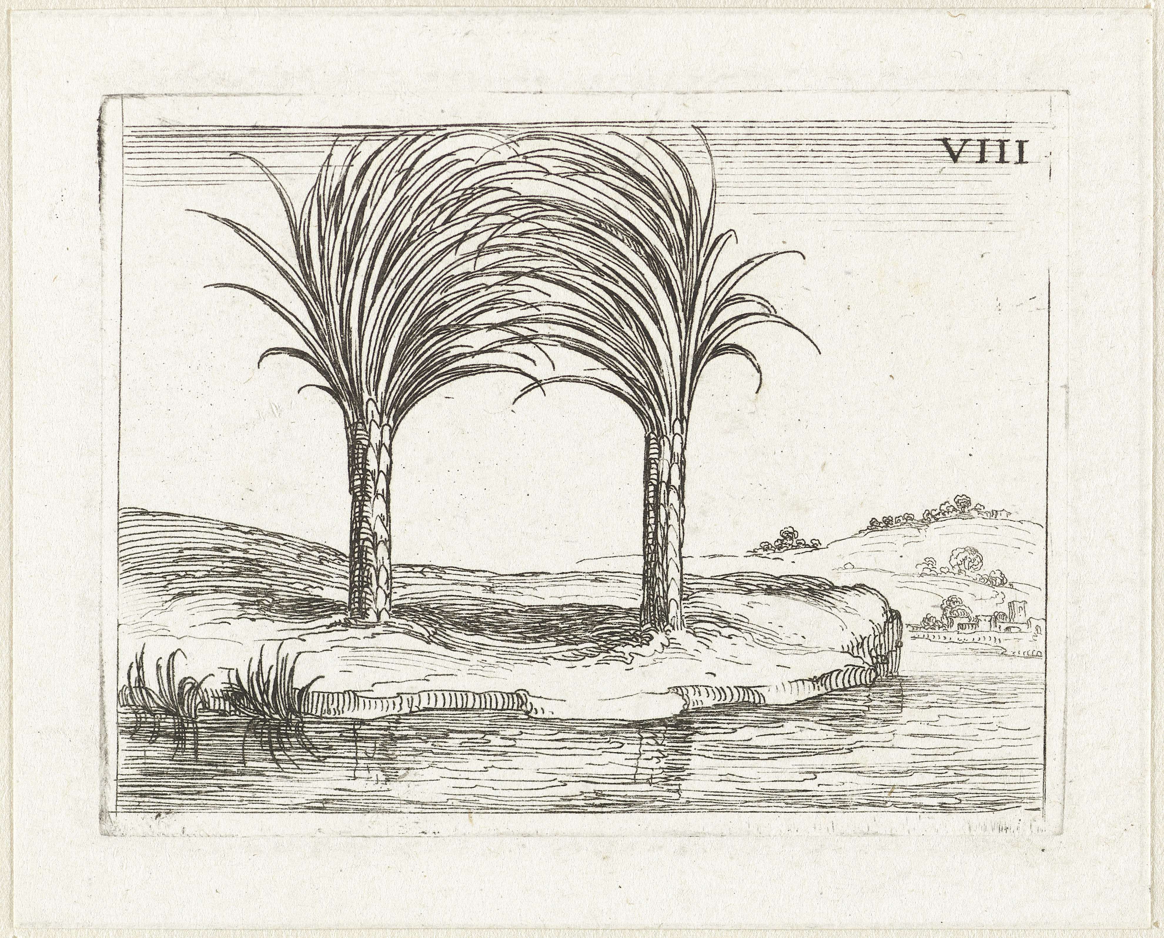Voorstelling van twee palmbomen die naast elkaar langs een waterkant staan, de kruinen in elkaar verstrengeld. Dit blad is onderdeel van de embleemserie 'Leven van Maria in emblemen'. De eerste staat van deze serie behelst naast een titelpagina en 26 emblemen ook drie bladen met lofzangen op Maria in boekdruk zonder afbeelding.