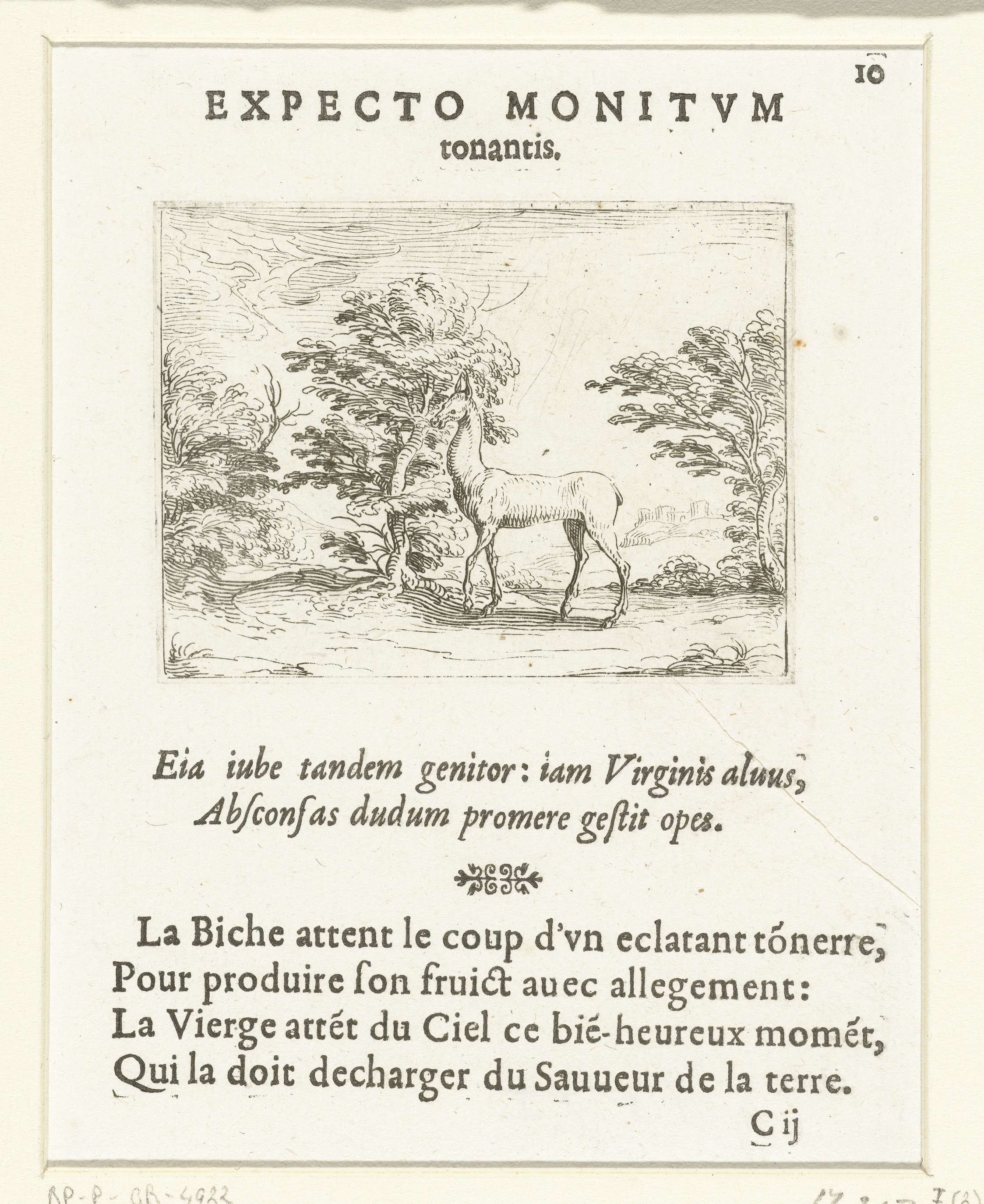 Voorstelling van een hinde in een bosachtige omgeving. Boven en onder deze prent Latijnse en Franse teksten in boekdruk. Dit blad is onderdeel van de embleemserie 'Leven van Maria in emblemen'. De eerste staat van deze serie behelst naast een titelpagina en 26 emblemen ook drie bladen met lofzangen op Maria in boekdruk zonder afbeelding.