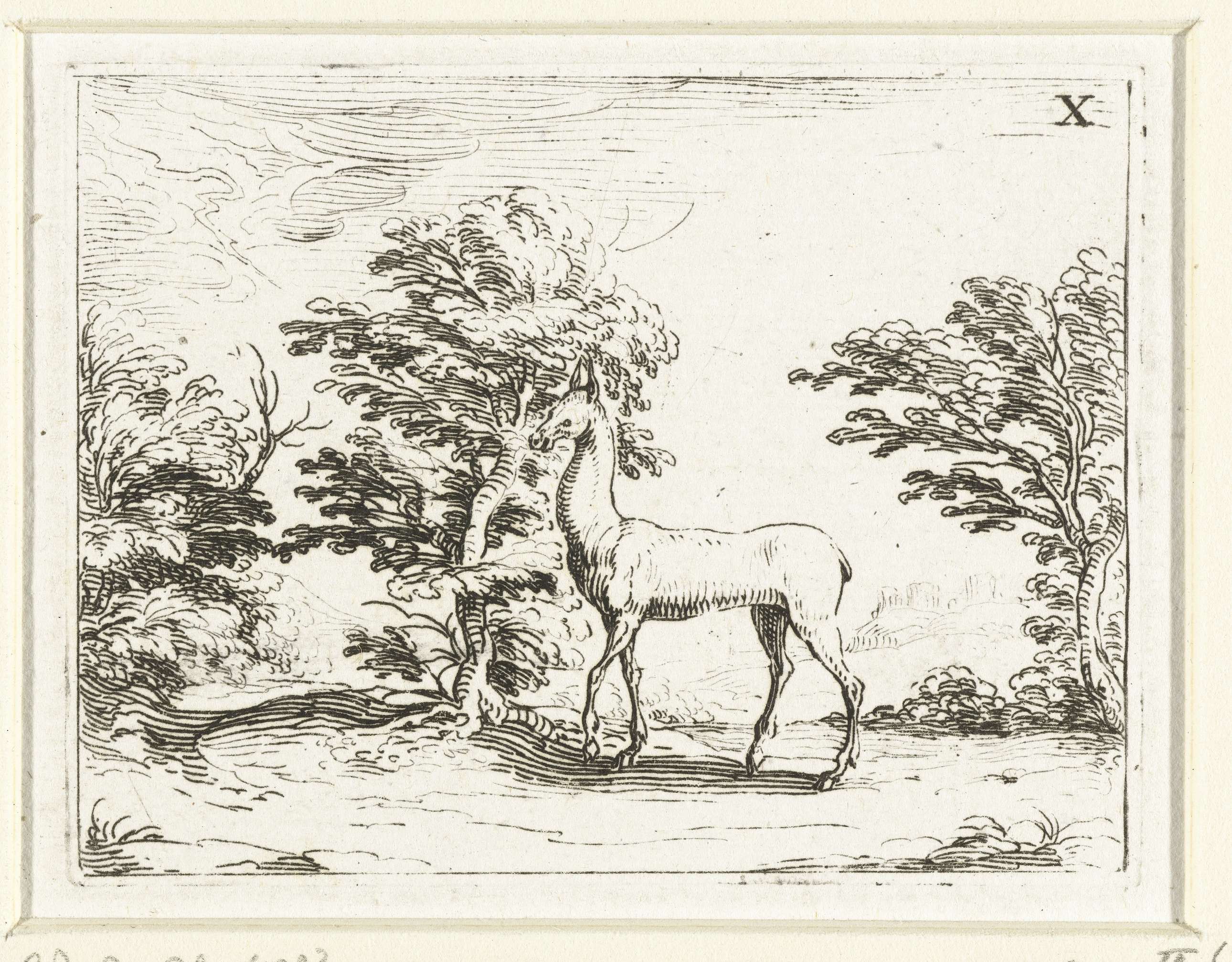 Voorstelling van een hinde in een bosachtige omgeving. Dit blad is onderdeel van de embleemserie 'Leven van Maria in emblemen'. De eerste staat van deze serie behelst naast een titelpagina en 26 emblemen ook drie bladen met lofzangen op Maria in boekdruk zonder afbeelding.
