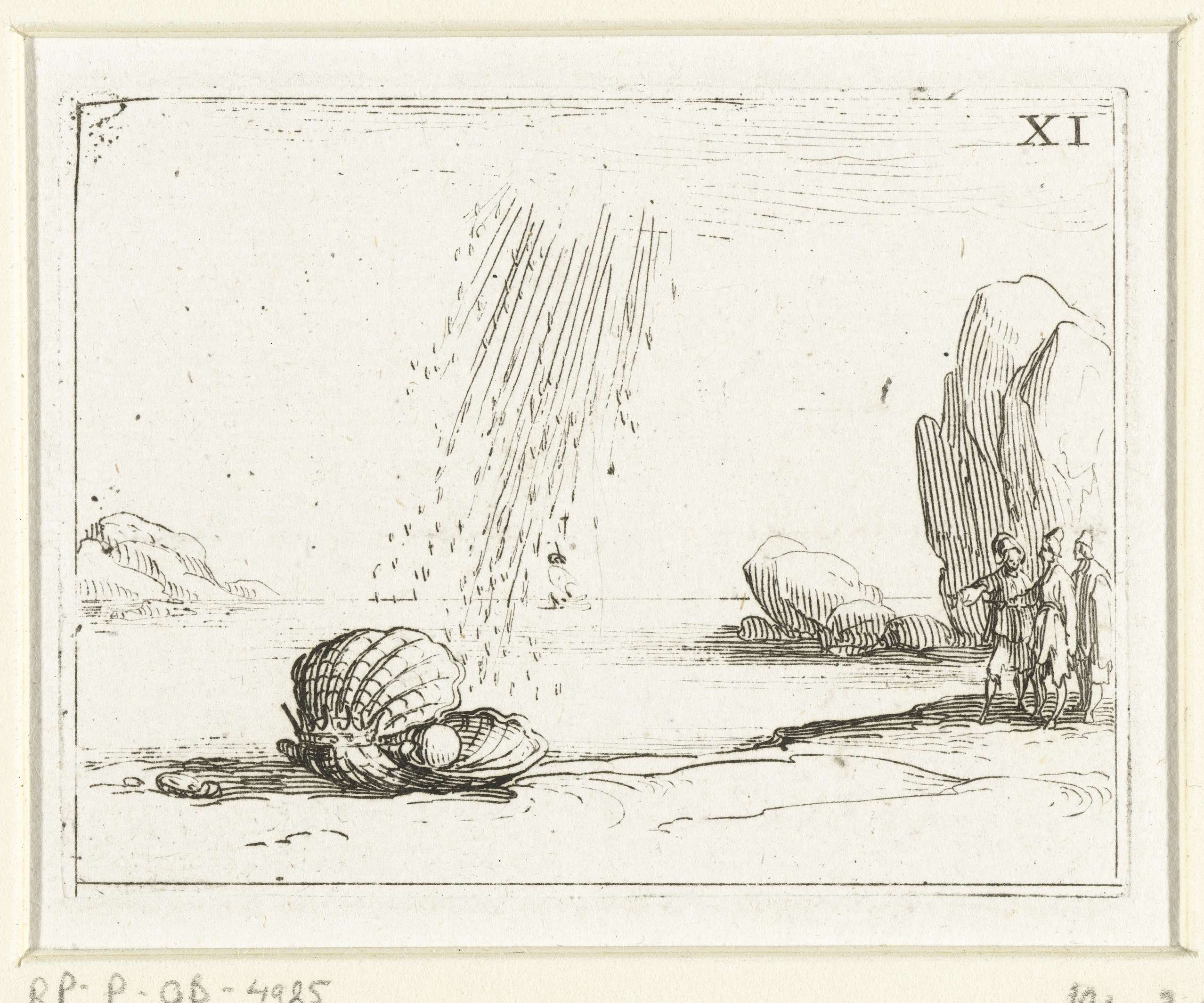 Voorstelling van een half geopende oester op een strand. Regen valt op de parel die in de oester ligt. Rechts drie mannen. Dit blad is onderdeel van de embleemserie 'Leven van Maria in emblemen'. De eerste staat van deze serie behelst naast een titelpagina en 26 emblemen ook drie bladen met lofzangen op Maria in ...