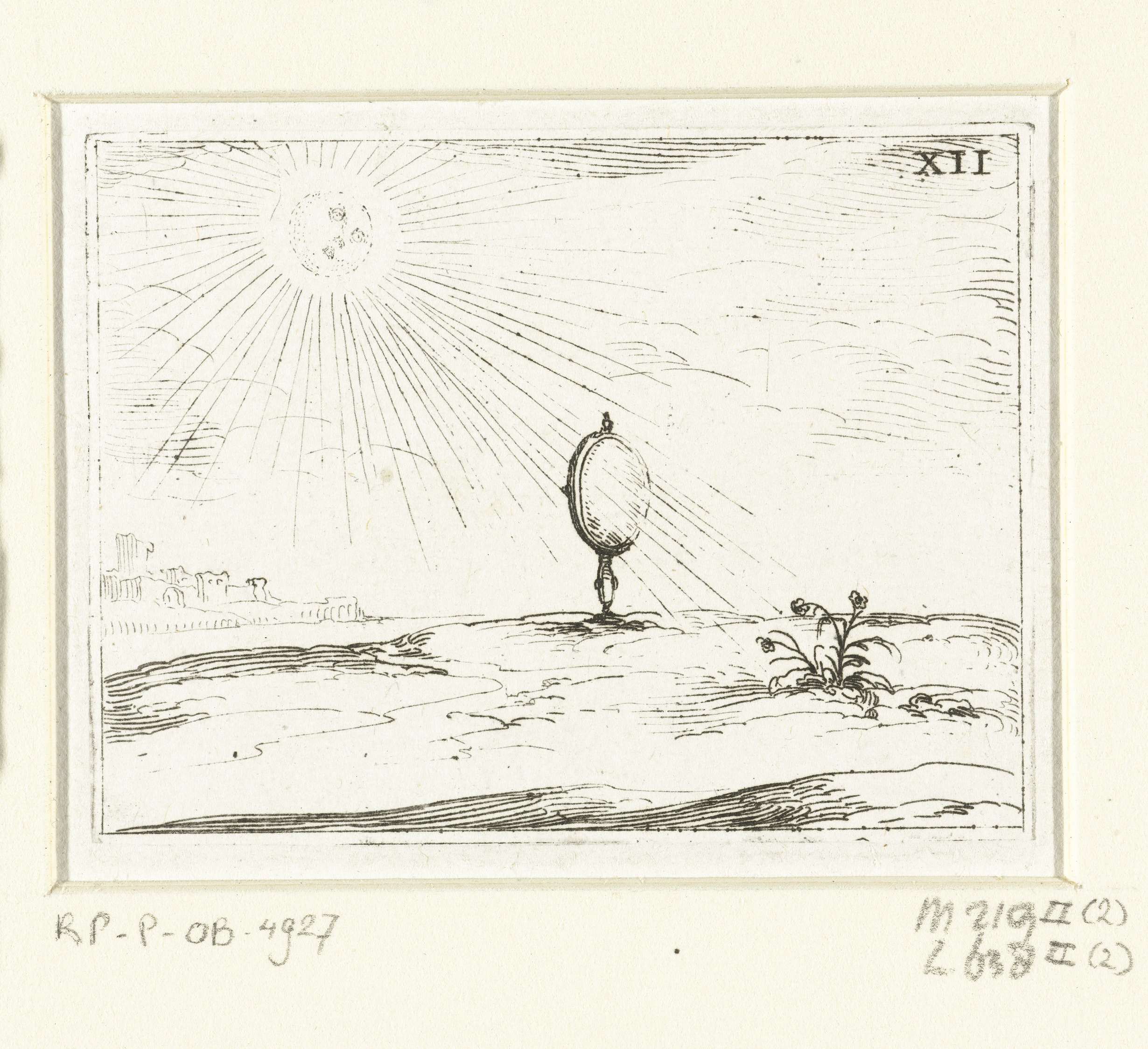 Voorstelling van een glas of spiegel in ronde omlijsting, rechtop staand op de grond, waardoorheen zonnestralen schijnen. Dit blad is onderdeel van de embleemserie 'Leven van Maria in emblemen'. De eerste staat van deze serie behelst naast een titelpagina en 26 emblemen ook drie bladen met lofzangen op Maria in boekdruk zonder afbeelding.