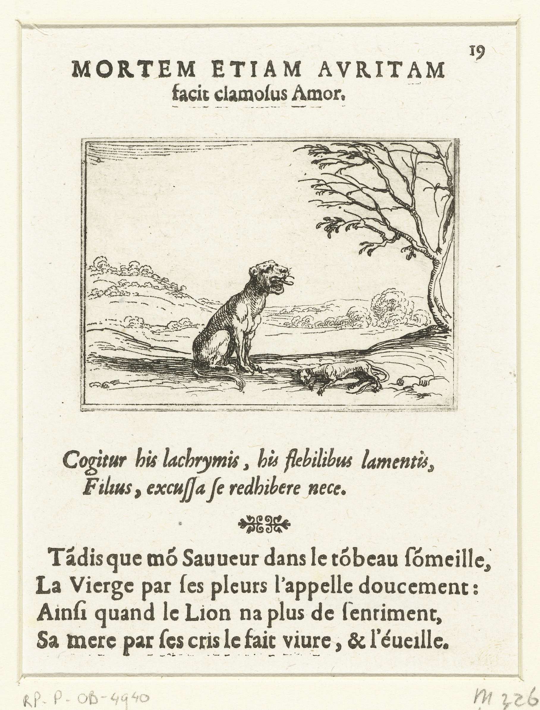 Voorstelling van een leeuwin die brult bij haar welp, dat levenloos op de grond ligt. Boven en onder deze prent Latijnse en Franse teksten in boekdruk. Dit blad is onderdeel van de embleemserie 'Leven van Maria in emblemen'. De eerste staat van deze serie behelst naast een titelpagina en 26 emblemen ook drie bladen met ...