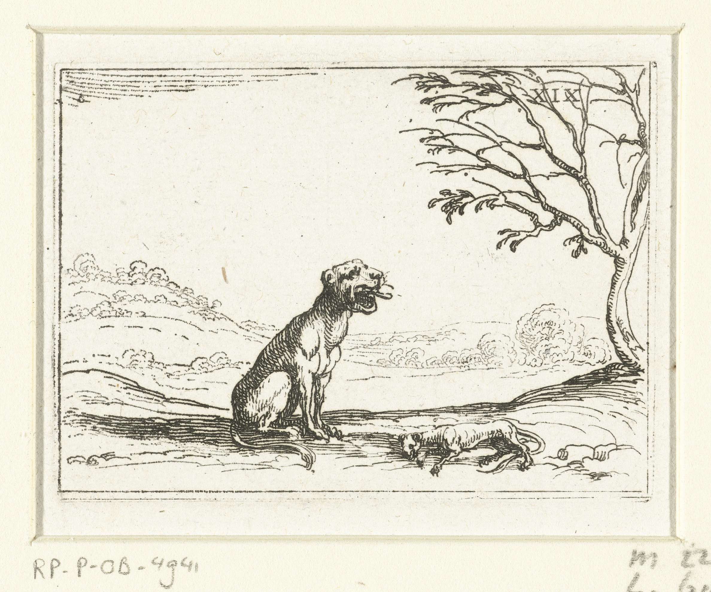 Voorstelling van een leeuwin die brult bij haar welp, dat levenloos op de grond ligt. Dit blad is onderdeel van de embleemserie 'Leven van Maria in emblemen'. De eerste staat van deze serie behelst naast een titelpagina en 26 emblemen ook drie bladen met lofzangen op Maria in boekdruk zonder afbeelding.