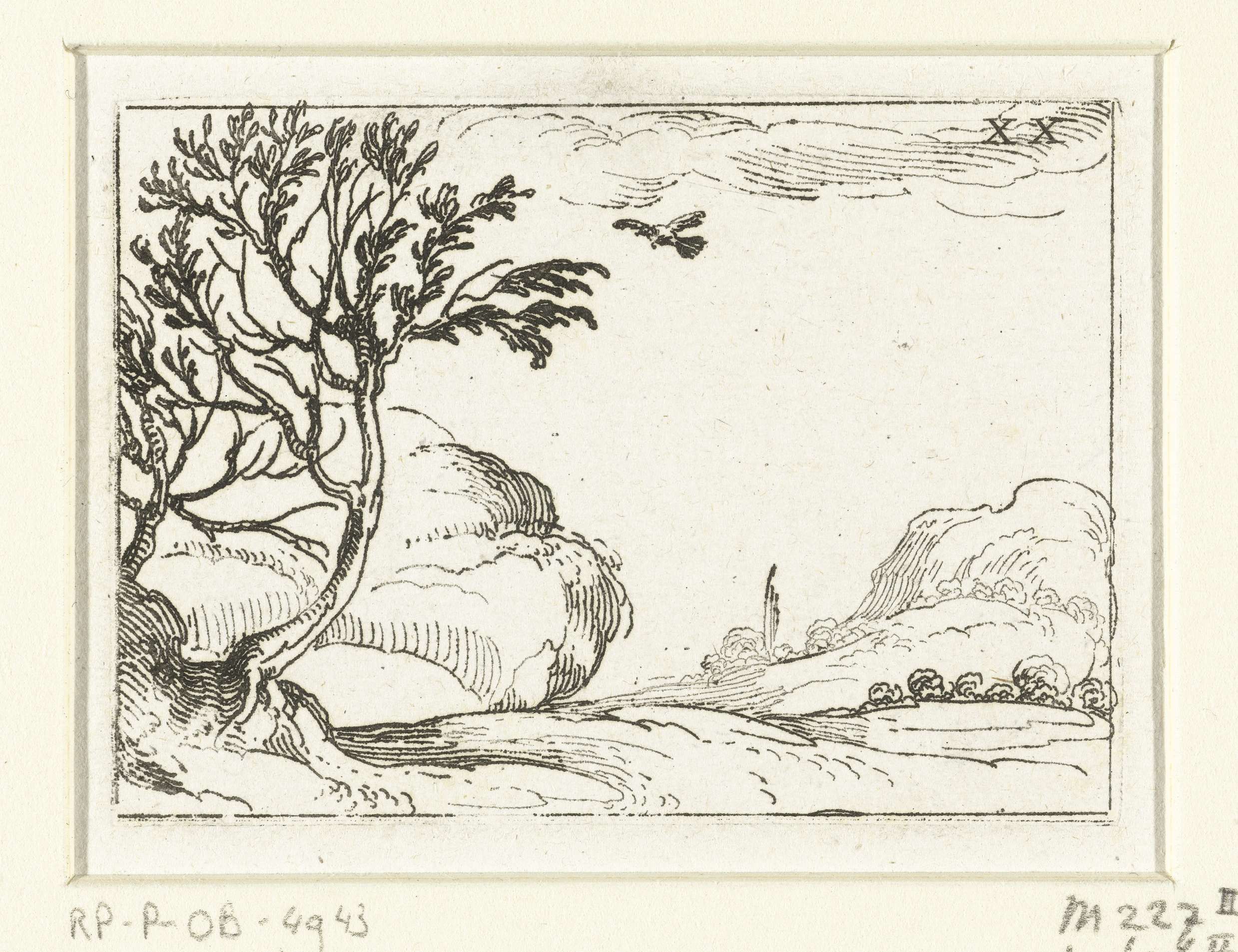 Voorstelling van een duif die over een kaal en verlaten landschap naar een boom vliegt. Dit blad is onderdeel van de embleemserie 'Leven van Maria in emblemen'. De eerste staat van deze serie behelst naast een titelpagina en 26 emblemen ook drie bladen met lofzangen op Maria in boekdruk zonder afbeelding.