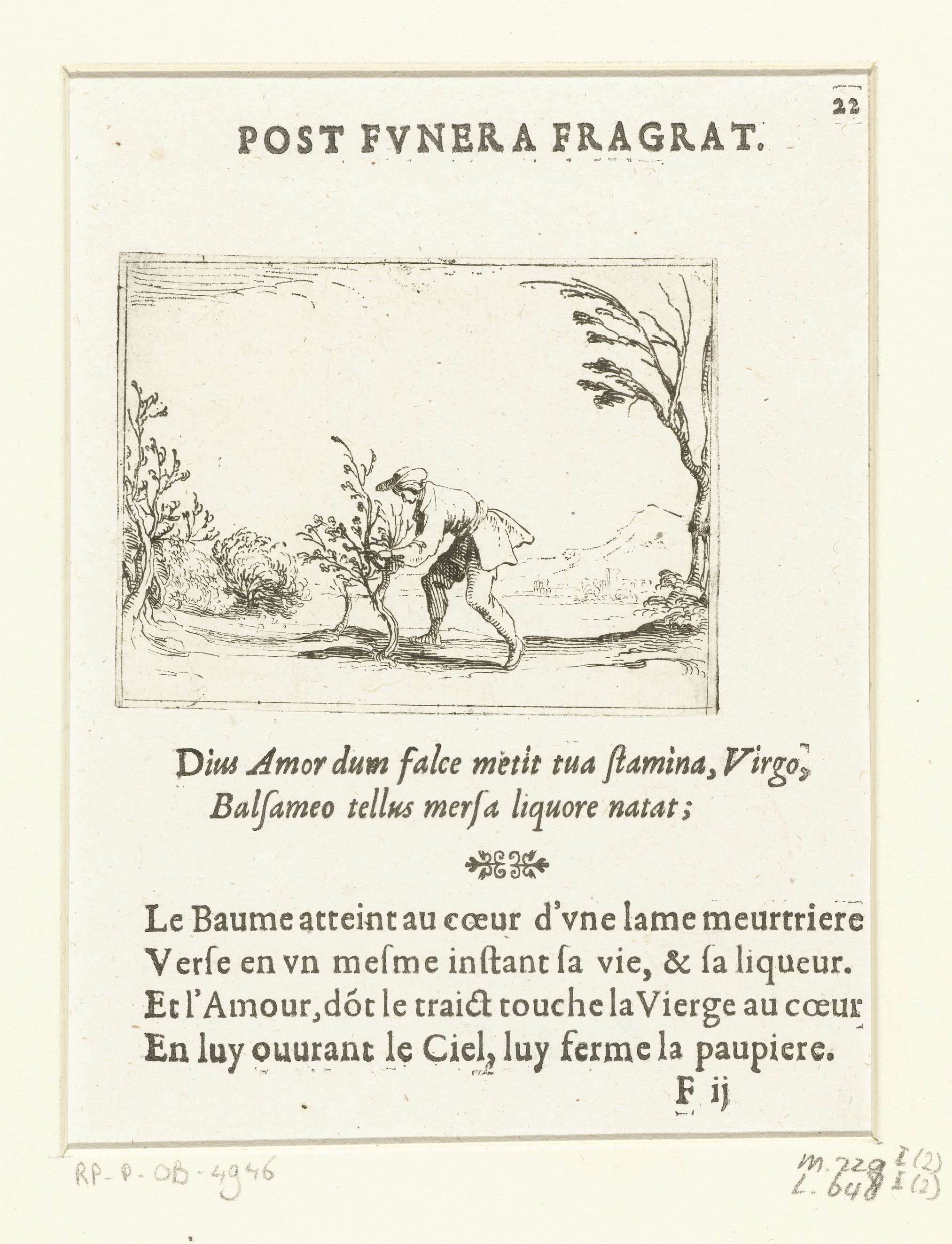 Voorstelling van een man die een klein boompje snoeit. Boven en onder deze prent Latijnse en Franse teksten in boekdruk. Dit blad is onderdeel van de embleemserie 'Leven van Maria in emblemen'. De eerste staat van deze serie behelst naast een titelpagina en 26 emblemen ook drie bladen met lofzangen op Maria in boekdruk zonder ...