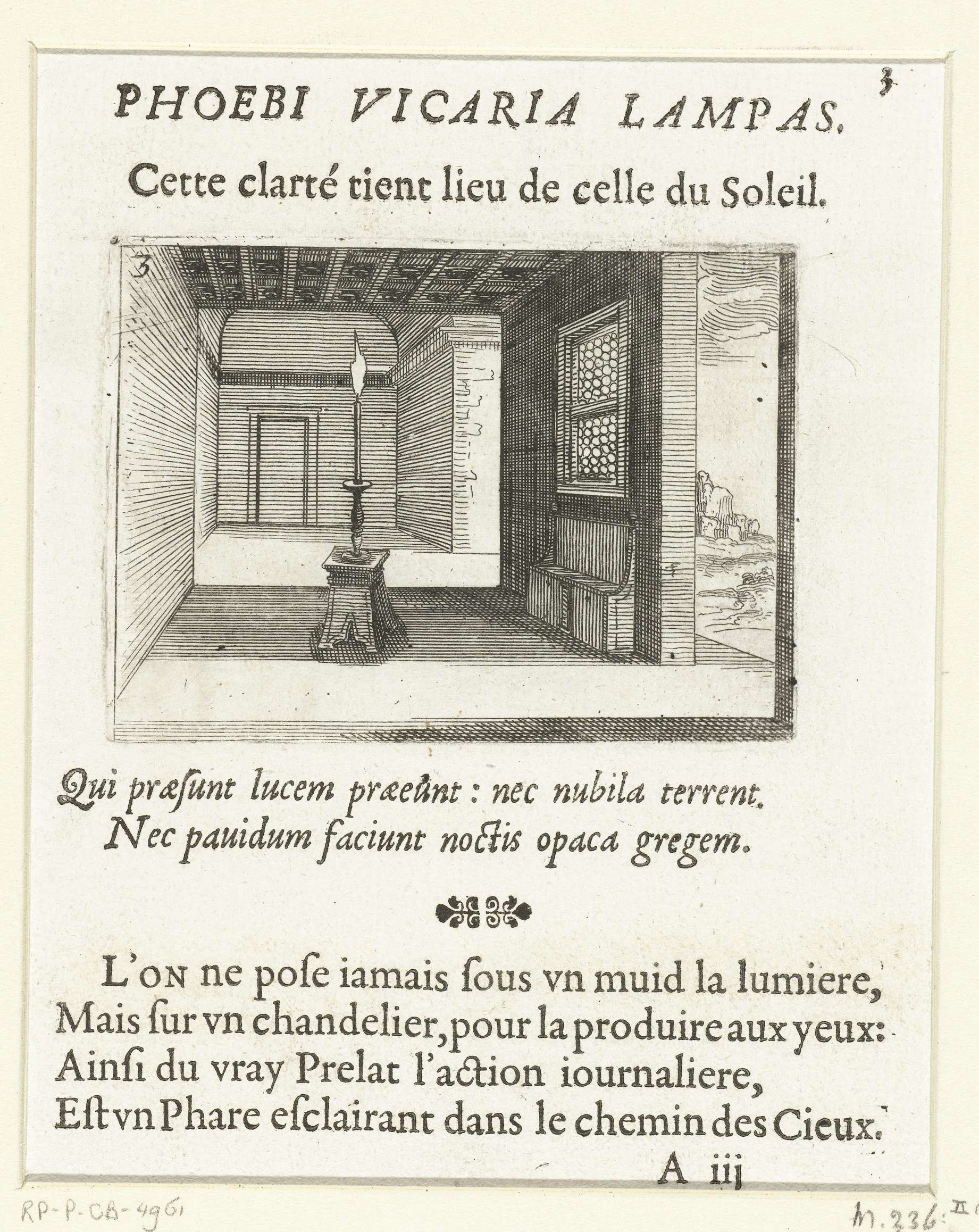 Voorstelling van een brandende kaars op een kruk in een leeg vertrek. Boven en onder deze prent Latijnse en Franse teksten in boekdruk. Dit blad is onderdeel van de embleemserie 'Kloosterleven in emblemen'. De tweede staat van deze serie behelst naast een geïllustreerde titelpagina en 26 emblemen nog een titelpagina en een blad met opdracht, ...