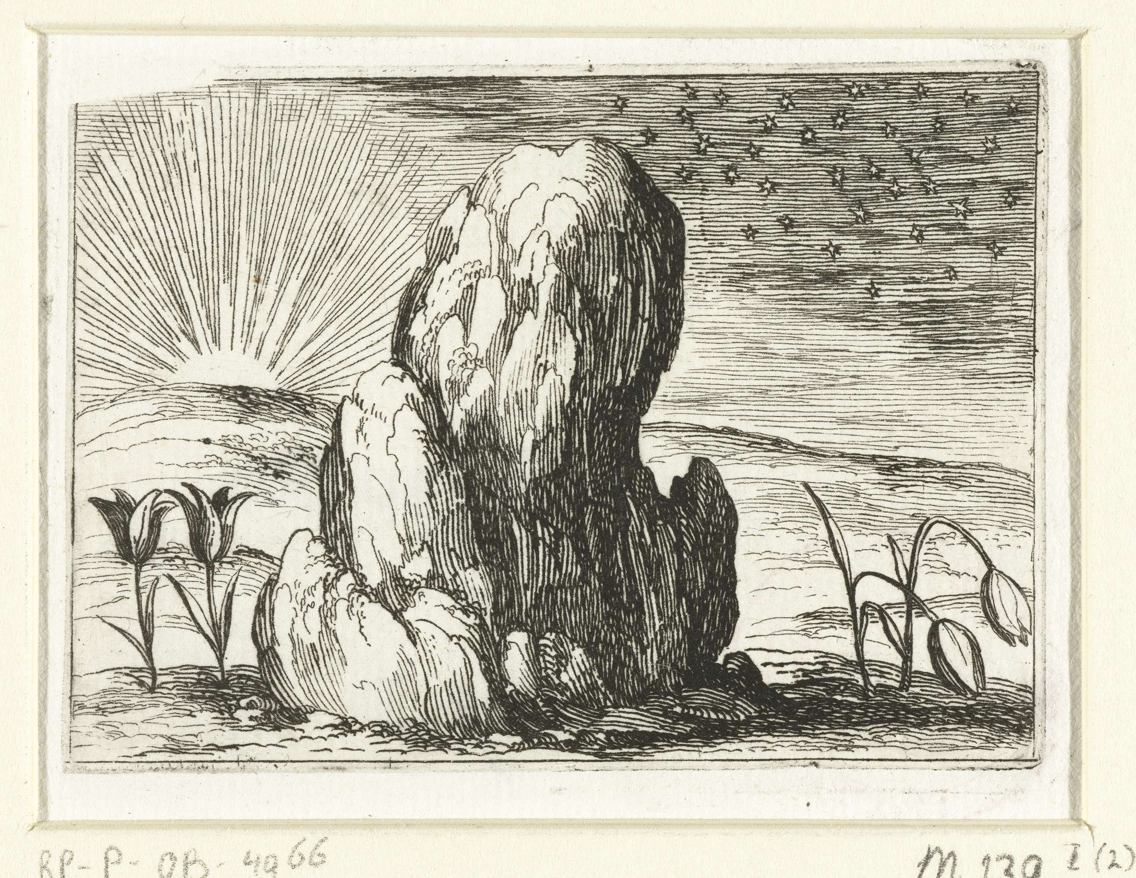 Voorstelling van twee tulpen rechtop in de zon, naast twee tulpen gebogen onder een nachtelijke hemel. Dit blad is onderdeel van de embleemserie 'Kloosterleven in emblemen'. De tweede staat van deze serie behelst naast een geïllustreerde titelpagina en 26 emblemen nog een titelpagina en een blad met opdracht, beide in boekdruk zonder afbeelding.