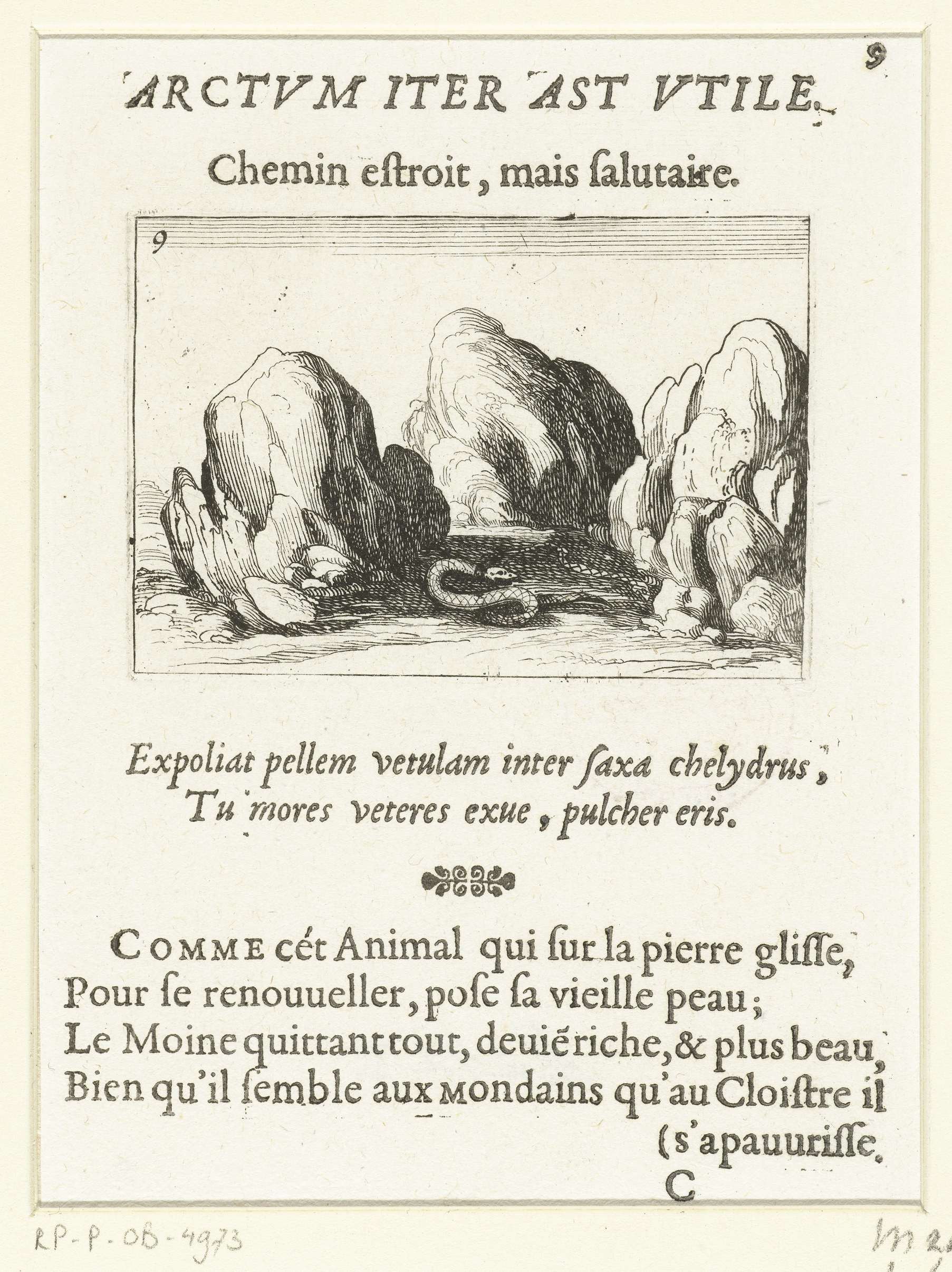 Voorstelling van een slang tussen de rotsen; het oude vel waarvan hij zich zojuist ontdaan heeft ligt rechts naast hem. Boven en onder deze prent Latijnse en Franse teksten in boekdruk. Dit blad is onderdeel van de embleemserie 'Kloosterleven in emblemen'. De tweede staat van deze serie behelst naast een geïllustreerde titelpagina en 26 emblemen ...