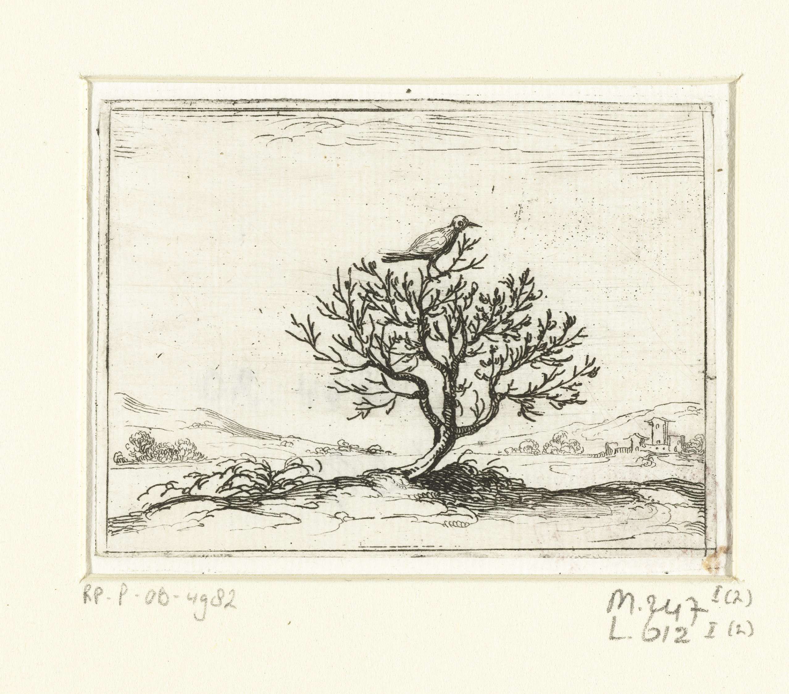 Voorstelling van een vogel die in een verlaten landschap op een struikje zit. Dit blad is onderdeel van de embleemserie 'Kloosterleven in emblemen'. De tweede staat van deze serie behelst naast een geïllustreerde titelpagina en 26 emblemen nog een titelpagina en een blad met opdracht, beide in boekdruk zonder afbeelding.