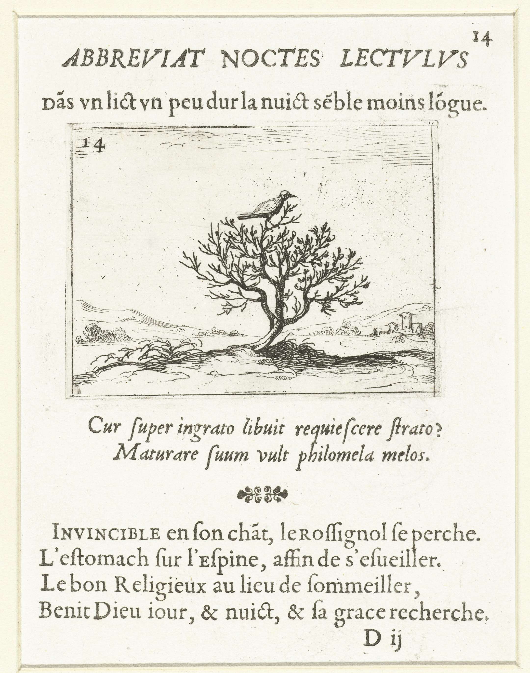 Voorstelling van een vogel die in een verlaten landschap op een struikje zit. Boven en onder deze prent Latijnse en Franse teksten in boekdruk. Dit blad is onderdeel van de embleemserie 'Kloosterleven in emblemen'. De tweede staat van deze serie behelst naast een geïllustreerde titelpagina en 26 emblemen nog een titelpagina en een blad met ...