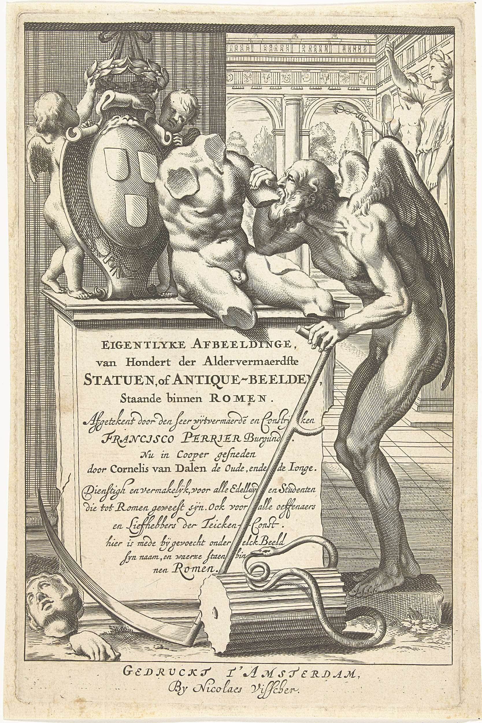 Vadertje Tijd met zeis staat bij fragmenten van Romeinse beelden