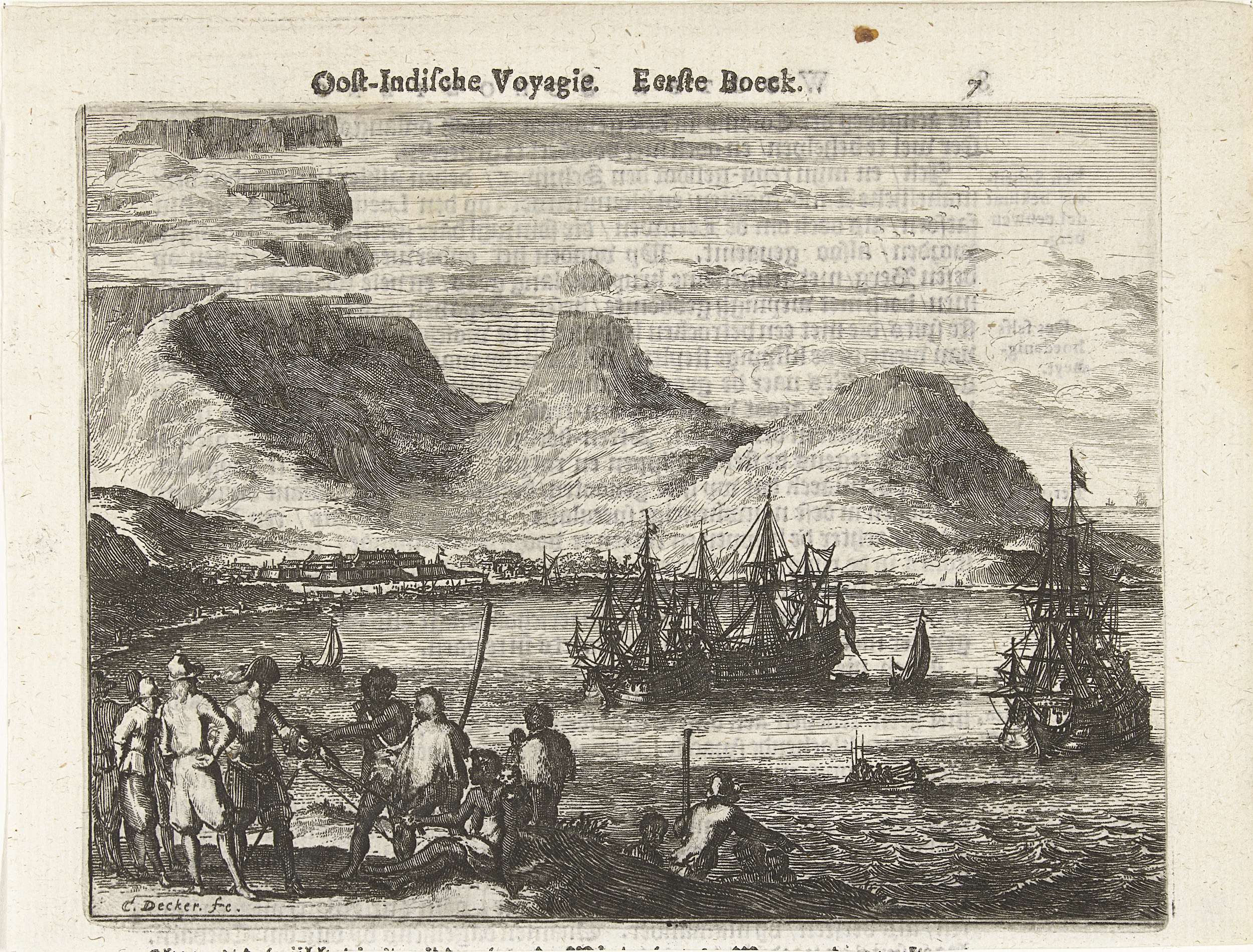 V.O.C. schepen bij Kaap de Goede Hoop. Op verso tekst in boekdruk.
