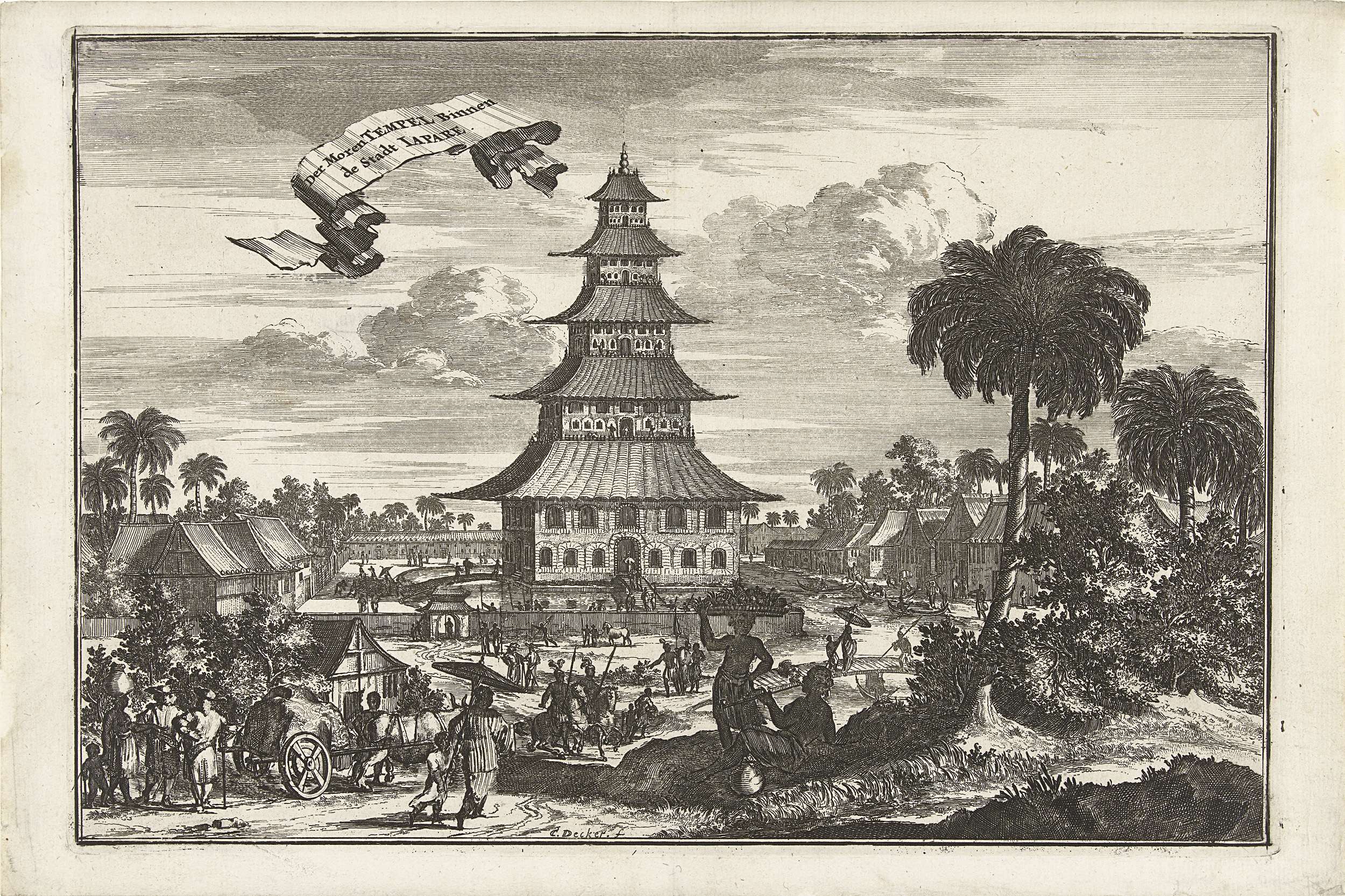 Gezicht op de pagode-achtige moskee van Japara op Java met inwoners in hun dagelijkse activiteiten.