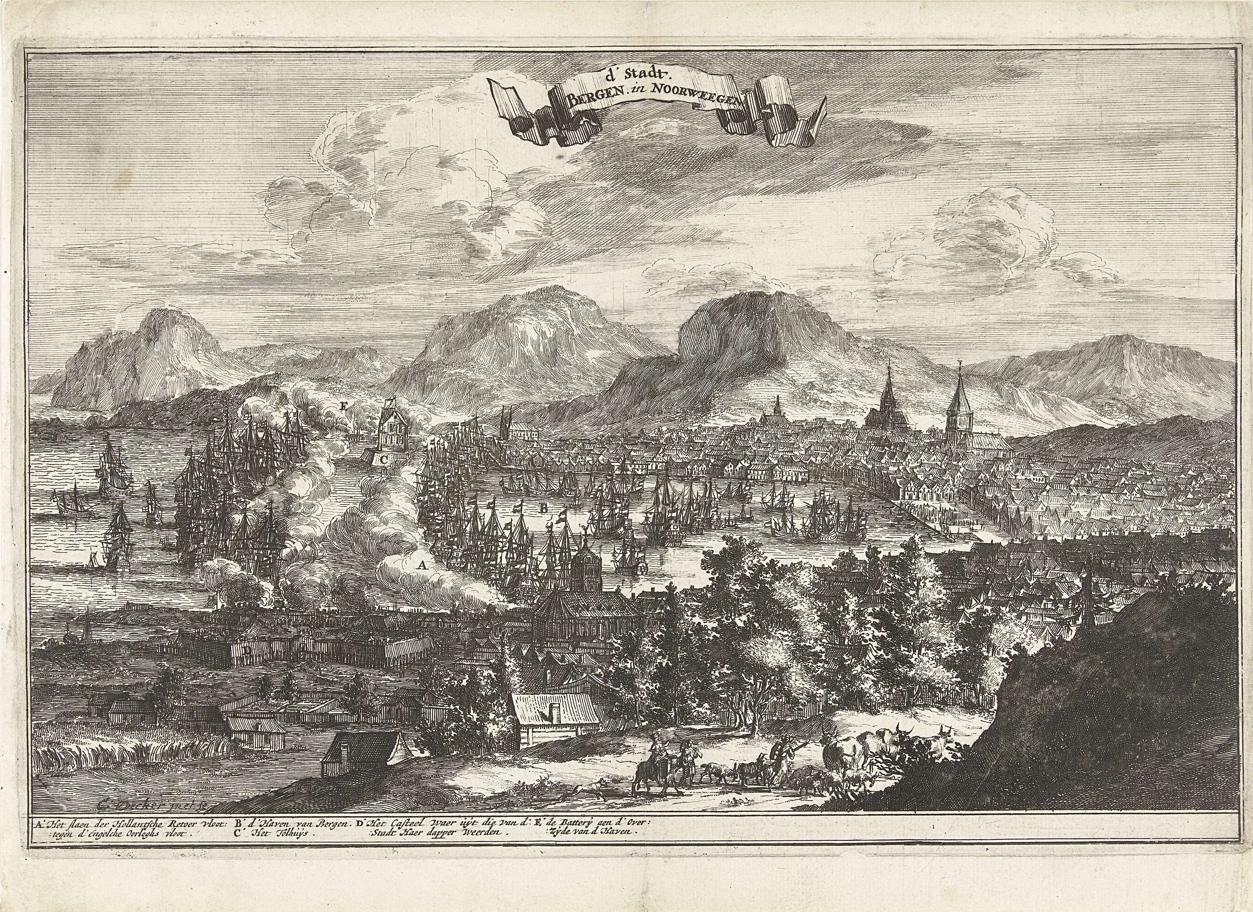 Stad Bergen verdedigd door Nederlandse vloot tegen Engelse aanval. In ondermarge verklarende lijst met duiding van de strijdende partijen.