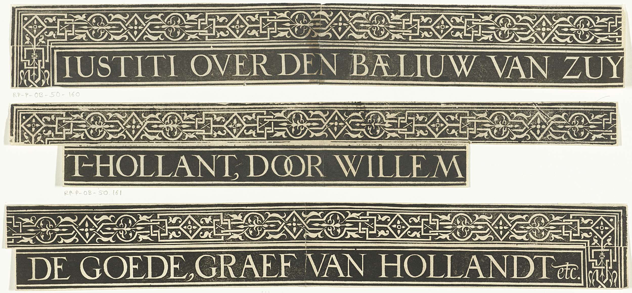 Ornamentale rand met titel. Derde van drie stroken tekst. Oorspronkelijk stond deze titel boven de grote centrale voorstelling in de prent van het verhaal van de Rechtspraak van graaf Willem III in het jaar 1336.