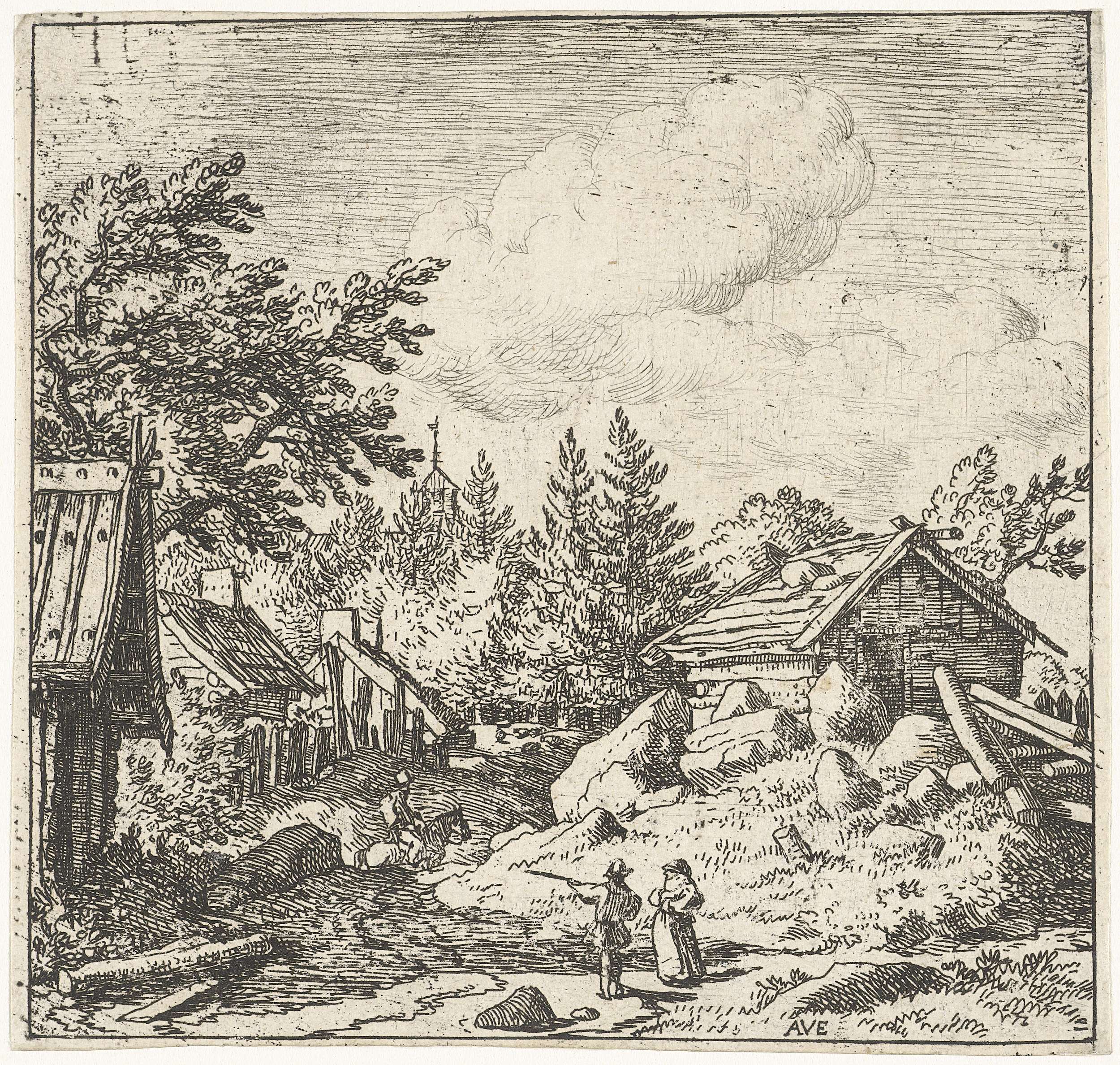 Gezicht op houten huizen aan weerszijden van een pad met grote keien. Op de voorgrond een man en een vrouw, iets verderop een man te paard.