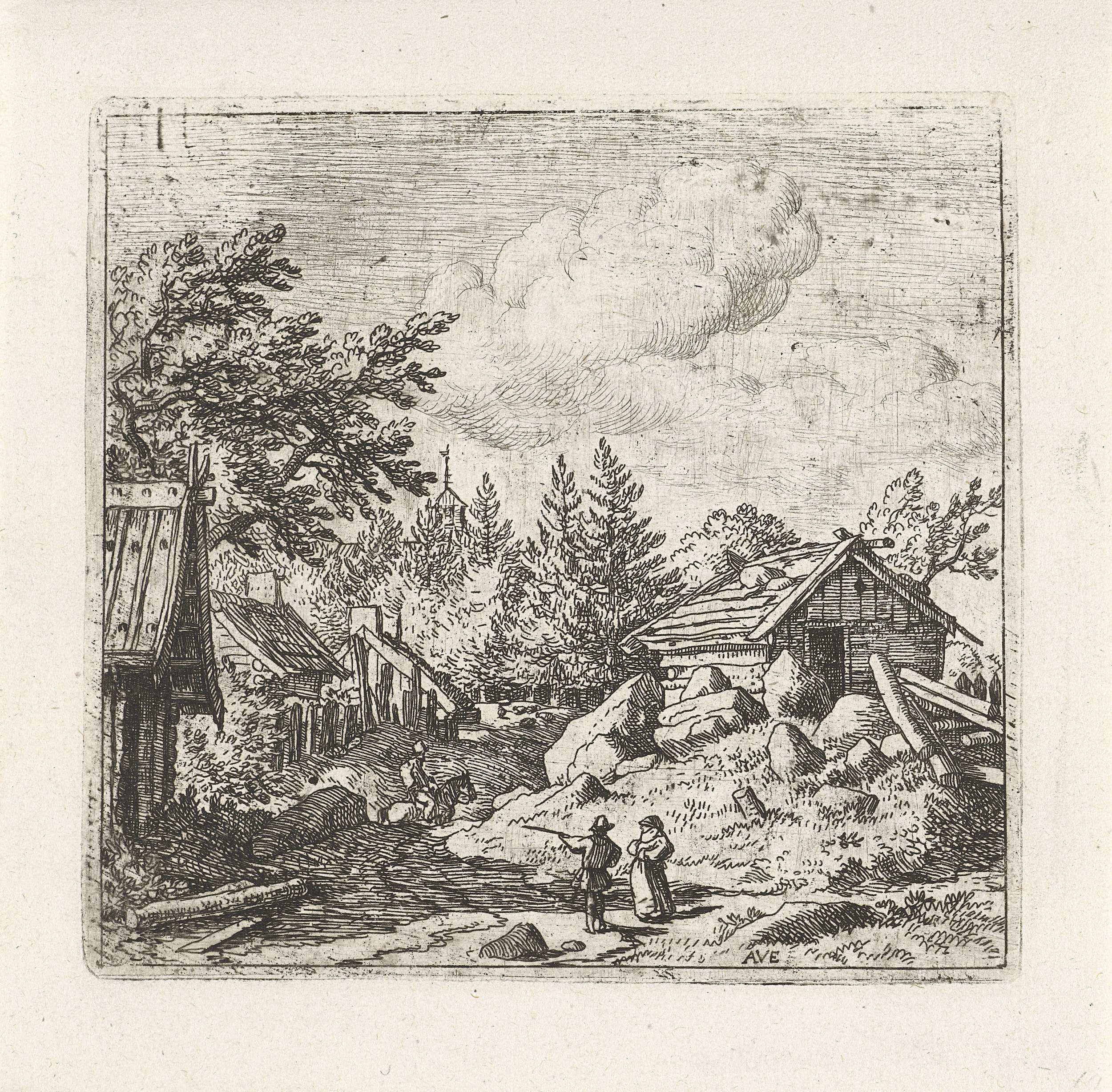 Gezicht op houten huizen aan weerszijden van een pad met grote keien. Op de voorgrond een man en een vrouw, iets verderop een man te paard.