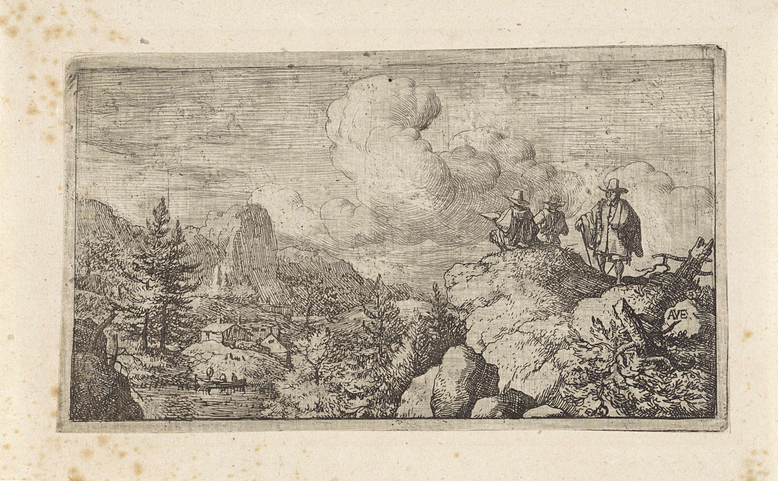Berglandschap met op de voorgrond drie mannen, waarvan er één een schetsboek in handen heeft.