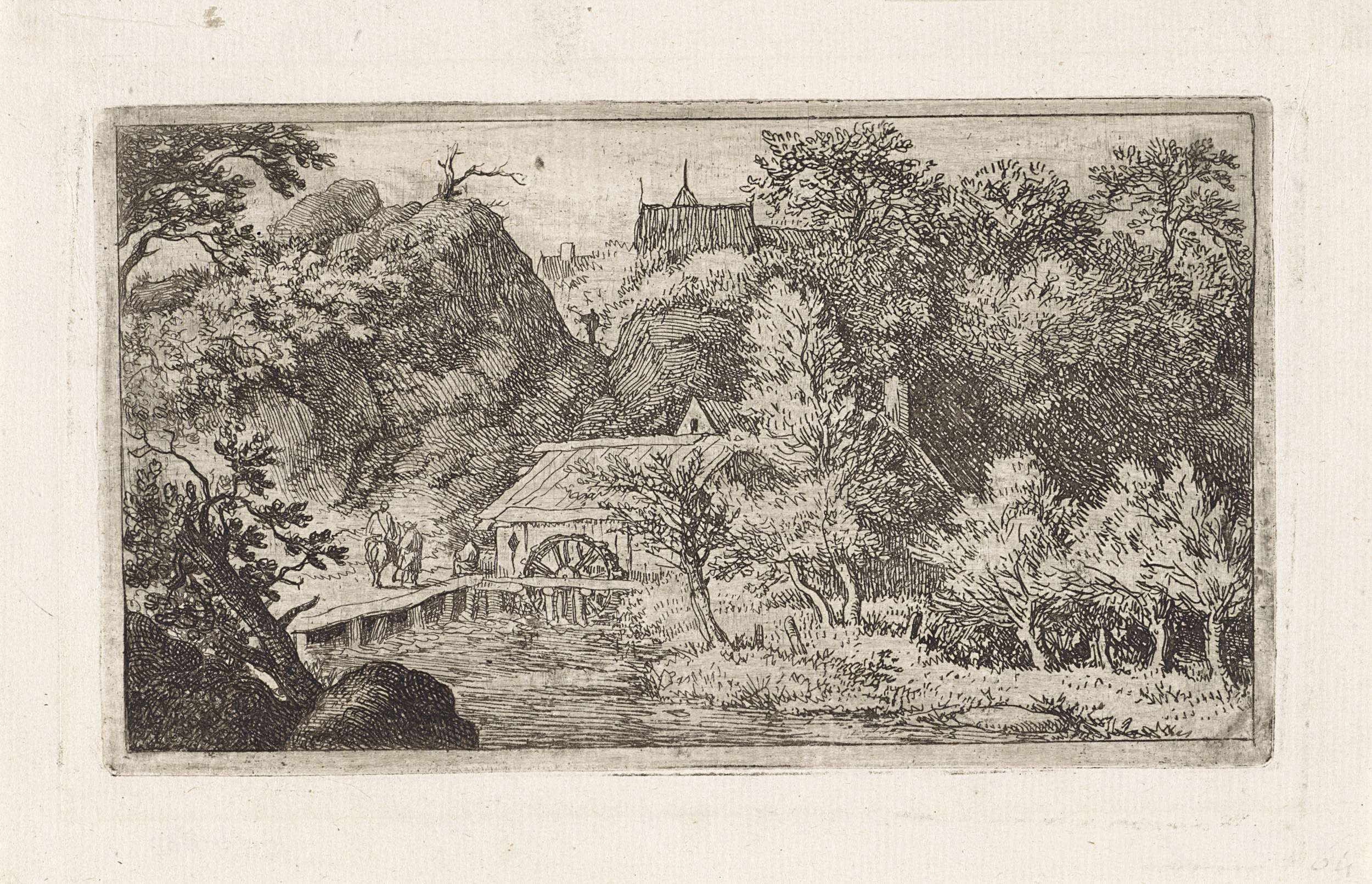 Landschap met uitzicht op drie personen bij een watermolen. Achter de bergen zijn enkele daken zichtbaar.