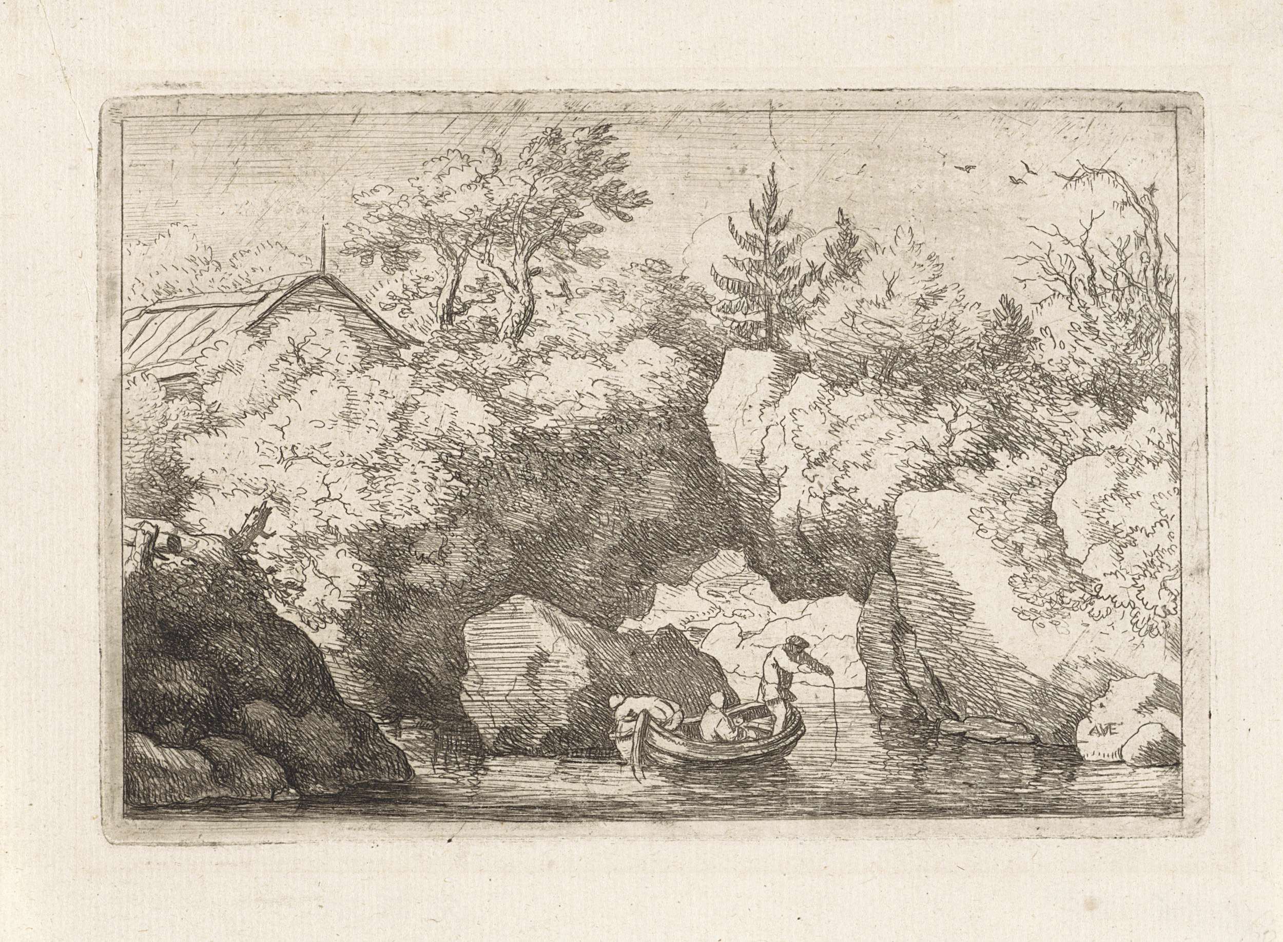 Een roeiboot met drie personen vaart in het water bij een doorgang in een dichtbegroeide rotspartij.